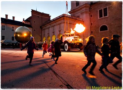 Im Rahmen einer Tanzperformance am Salzburger Kapitelplatz spielten 15 Moosdorfer Kinder ihre Rollen sehr überzeugend, als sie in Panik vor einem feuerspeienden Drachen fliehen mussten.