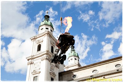 Dieser Drache war ein Lastwagen der an einem Kran über dem Kapitelplatz schwebte und tatsächlich Feuer spuckte. Am Boden wartete bereits der mutige Drachtentöter, eine anmutige Tänzerin mit Schwert, die in schließlich besiegte.