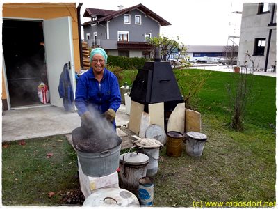 Heute, so erzählt sie mir als ich vorbeiradle und nach dem Feuer im Garten frage („Nochmal grillen, vor dem Winter?“) haben sie um 7 Uhr morgens angefangen. Aber nur wenn man früh anfängt hat man die Chance, alles fertig zu bekommen. Und der „Ofen“ muss ja auch erstmal auf Temperatur kommen. Darum raucht es auch gewaltig.