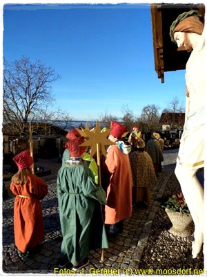 Im gleißend hellen Sonnenschein zog schließlich unser Pfarrer mit den fleißigen Jugendlichen und Kindern in ihrer festlichen Gewandung aus der Kirche aus. Jetzt wird das königliche Festgewand abgelegt, damit es im nächsten Jänner wieder, voran mit den Sternen, für die nächste „Drei-Königs-Aktion“ glänzen kann. Ein Wintertag ist’s nicht, aber ein echter Strahletag, dieser „Drei-Königs-Tag“ 2014 in Moosdorf!
