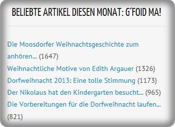333 Meldungen pünktlich zur Karnevalszeit. 333 Texte die wir für euch geschrieben und produziert haben. Und dazu mit dem Dezember das erfolgreichste Monat seit es Moosdorf Live gibt: fast 6.000 mal wurde im Dezember auf „G´foid ma“ geklickt. Und selbst diese Zahl bezieht sich nur auf die 5 Top-Geschichten des Monats Dezember (siehe Abbildung). Würde man alle zählen, käme man auf noch deutlich mehr. Man kann sagen – abgesehen vom Wahlspezial im letzten Jahr – haben euch unsere Weihnachtsseiten in 2013 am besten gefallen.