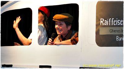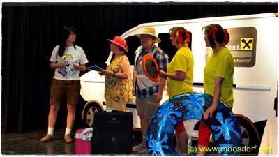 Aber es gibt nicht nur den Blues, schon gar nicht bei so einer lustigen Feier. Auch fröhlich wird das Dorfmobil vertont. Mit dem Dorfmobil-Lied.