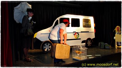 Eine Dame mit Unmengen an Gepäck strapaziert die Nerven des Dorfmobil-Fahrers und muss dann doch wieder heimgebracht werden, weil sie sich um einen Tag im Datum geirrt hat. Der Fahrer nimmt’s gelassen und meint: „Macht nix, gnä‘ Frau, is kein Malheur, morgen fahrt eh ein anderer Chauffeur!“