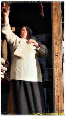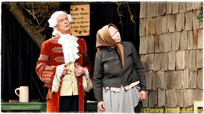 Zwei Figuren, die sich im Laufe des Abends in die Herzen der Zuschauer spielen, sind noch zu erwähnen: der Dorfschreiber Lichtlein, bestens besetzt mit Gunther Boennecken, der nicht nur eine enorme Textmenge bewältigen muss, sondern dazu auch noch die Figur vom untertänigen Schreiber zum gewitzten „Ankläger“ entwickelt – und damit letztlich zum neuen Dorfrichter wird.