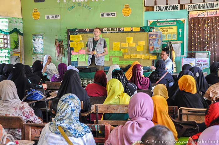 So besuchen wir taeglich eine dieser Gemeinschaften mit unterschiedlichen Menschen. Mal sind es Generaele des Philippineschen Militaers, mal die Kommandaten und Anfuehrer der Moro Islamic Liberation Front. Wir besuchen islamische sowie christliche Fraueninitiativen, Veranstaltungen fuer jugendliche und Junge erwachsene sowie Versammlungen von Religiousen und (Sicherheits-)Politischen Meinungsfuehrer und sind offen fuer Ihre Sorgen und Hoffnungen sowie ihren Erwartungen fuer die Zukunft der Gemeinschaften in denen sie leben.