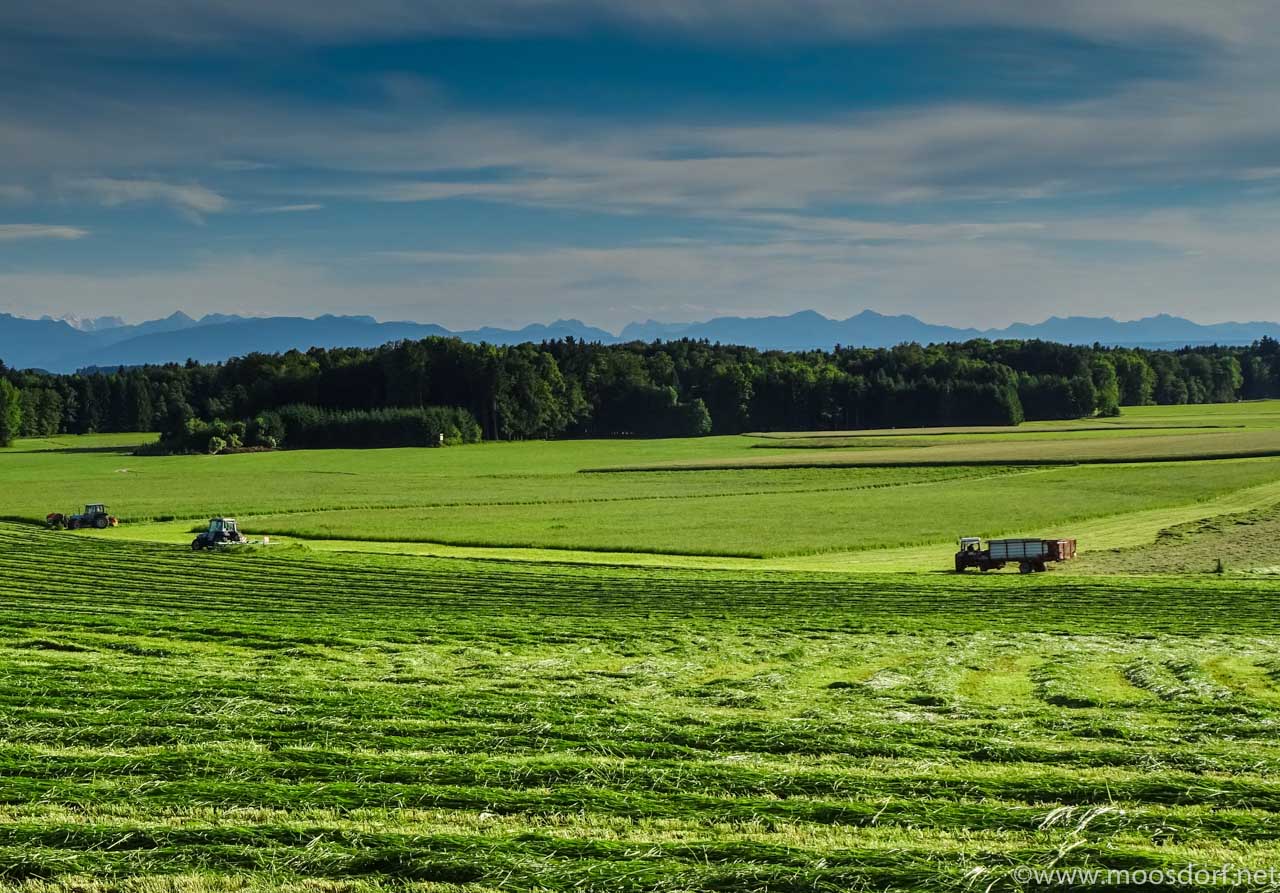 „Für die, die hier zuziehen ist eine Wiese irgendwie nur eine Wiese. Aber das ist nicht so. Das ist viel mehr…“, das sagte mir ein junger Bauer aus Moosdorf irgendwann einmal nachts bei einem Festabend. Der Gedanke ließ mich dann nicht mehr los. Und gestern und vorgestern war gerade wieder viel los auf unseren Wiesen. Und alles drehte sich ums Gras: grasen, heuen, mähen – all das löste emsige Betriebssamkeit aus. Und als ich mir die Bilder die herausgekommen sind so ansah, dachte ich mir: die zeig ich euch mal. Denn ein bißchen demonstrieren sie das, was der Jungbauer aus Moosdorf mir gesagt hat: es ist mehr als nur Wiese und Gras. Viel Spaß beim betrachten der kleinen Bildergalerie.