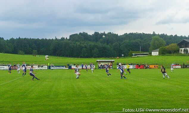 Die Munderfinger legten einen Blitzstart hin. Nicht einmal eine Minute war gespielt als Christoph Laimer den Ball zu unseren Tormann Klaus Reschenhofer zurückspielt, dieser lässt sich zu viel Zeit beim Abschlag und schießt somit den heraneilenden Wolfgang Griessner an, welcher dann an den Ball kommt und aus spitzem Winkel ins leere Tor schiebt. Der FC Munderfing wirkte in den Anfangsminuten spritziger, giftiger und sie waren immer einen kleinen Schritt voraus. Die Gäste erspielten sich eine Vielzahl an guten Möglichkeiten. Doch entweder war Klaus Reschenhofer ein starker Rückhalt oder der Ball streifte knapp am Tor vorbei. Der USV hätte sich hier nicht über einen höheren Rückstand beklagen dürfen. Nach der starken Anfangsphase schaffte es der USV sich aus der Drangphase zu lösen und setzte selbst erste Akzente nach vorne. Michael Baischer legt den Ball zurück auf Johann Dürager, dessen strammen Schuss aus 22 Metern kann der Torhüter allerdings zur Seite abwehren. Wenige Minuten später der nächste Rückschlag für den USV. Goalgetter Philipp Ramitsch kassiert eine gelbe Karte – mit Folgen – somit fehlt er im nächsten Spiel auswärts in Münzkirchen. Vor der Halbzeit gibt es noch zwei fast identische Torchancen für Munderfing. Peter Chocolaty zieht rechts auf und kann unbedrängt auf den langen Pfosten flanken, dort steht beide Male Robert Annamichl total frei, er kann aber beide Torchancen nicht im Tor unterbringen. Somit geht es mit einer hochverdienten Gästeführung in die Kabine.