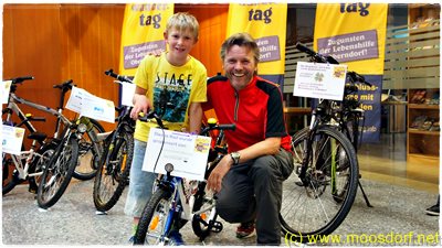 Nicht vergessen: auch dieses Jahr gibt es wieder den Radwandertag zugunsten der Lebenshilfe in Oberndorf. Also: bereitet euch vor! Das Bild zeigt den Gewinner des von Moosdorf gespendeten Rades.