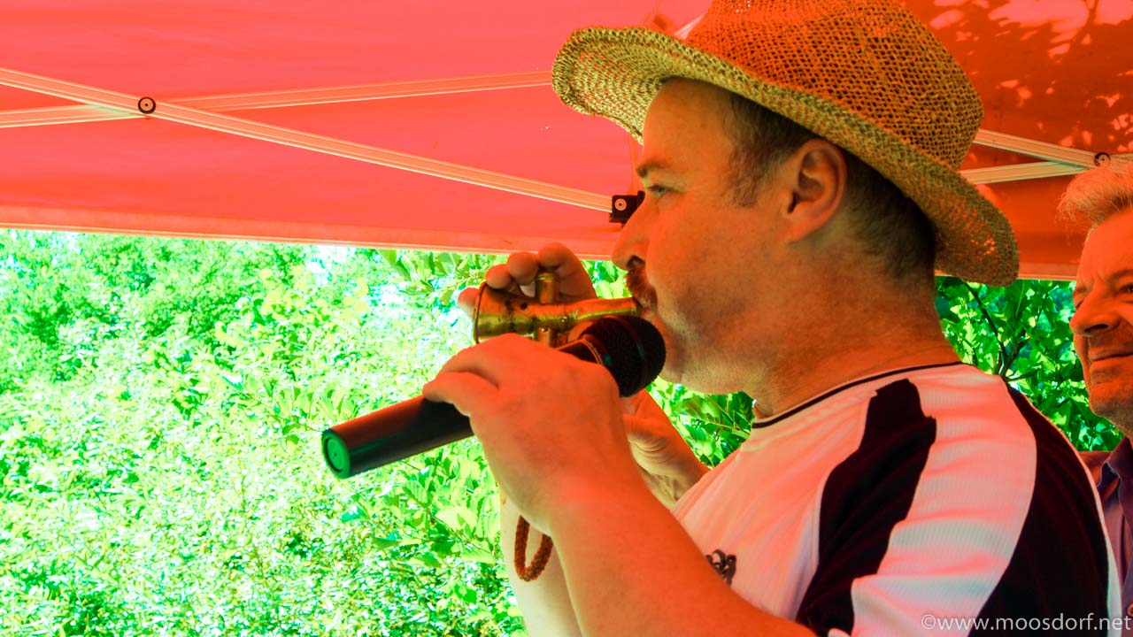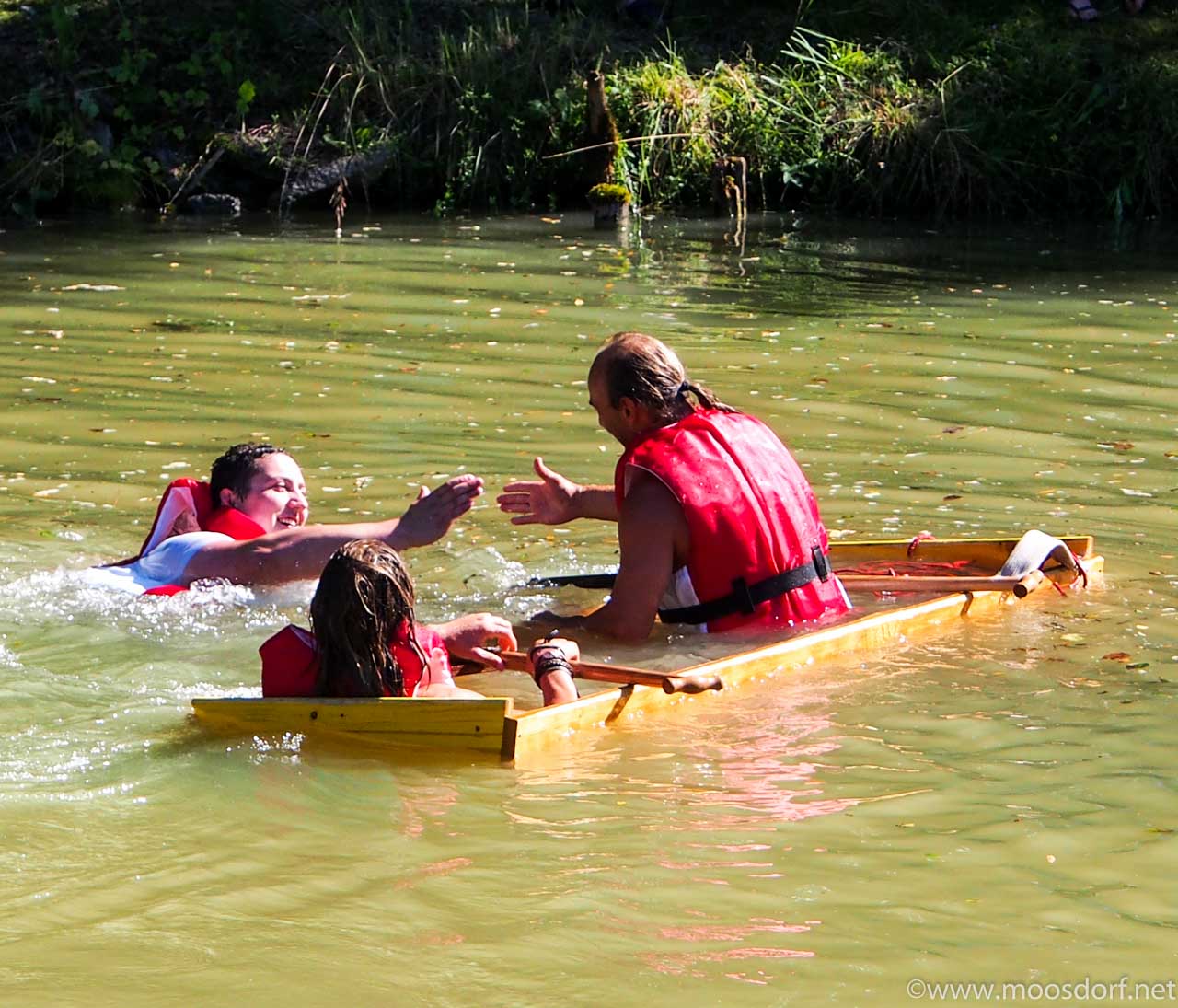 Insgesamt mischten 16 Teams mit, ein Seniorenteam (dass sich erst seeeehr spät entschloss) wurde abgelehnt – vermutlich weil der Rollator im Sautrog schlecht Platz gehabt hätte. Und Roland Andraschko hatte als Moderator nicht nur alles im Griff sondern immer einen guten Spruch und die richtigen Musiktakte dabei, wenn mal etwas Zeit überbrückt werden musste, weil völlig ausgepowerte Teams nur sehr langsam zurück paddelten oder auch die eine oder andere Schwimm- und Bergungsarbeit bei den Sautrögen ein wenig dauerte.