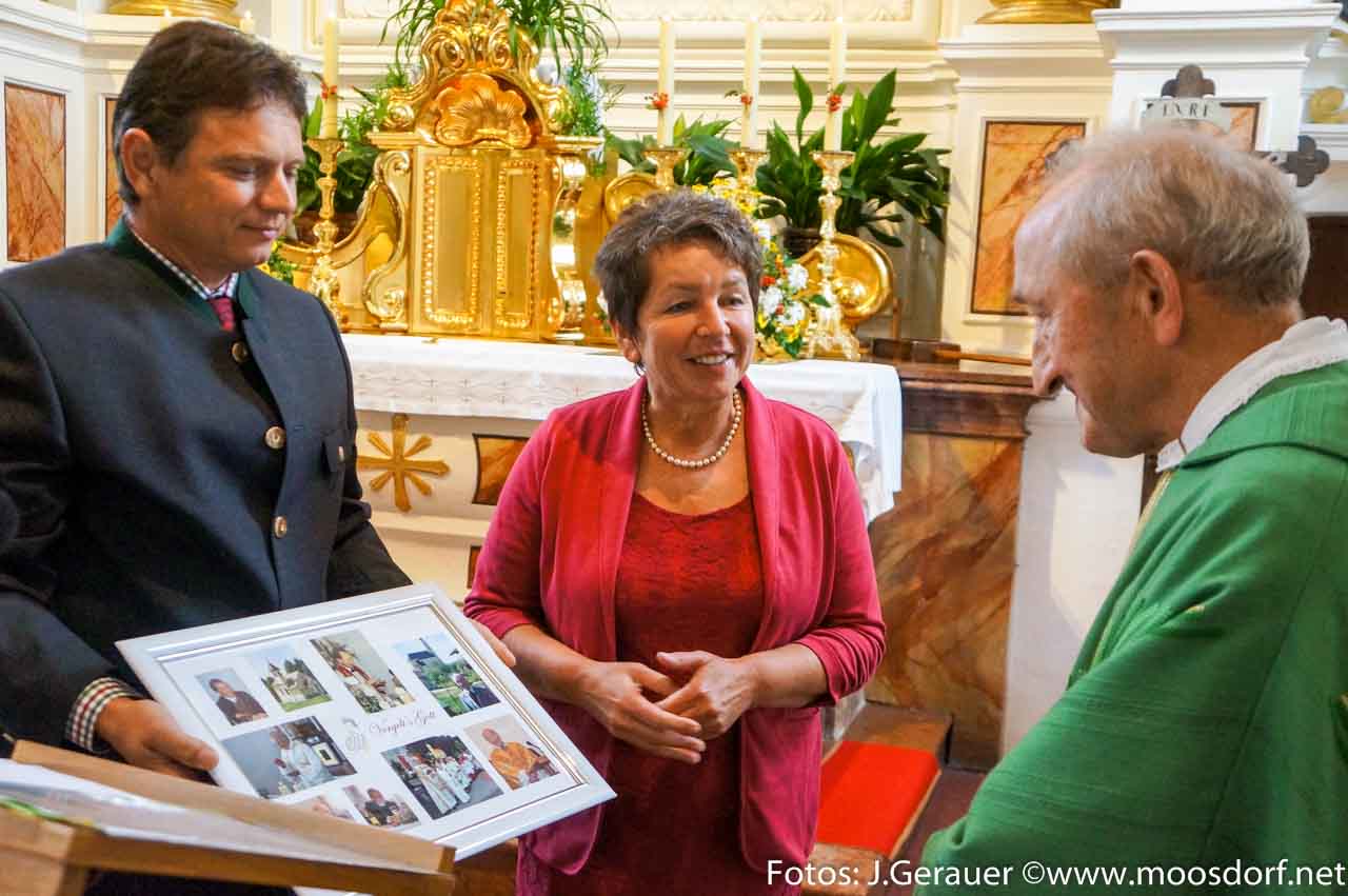 Zu dem überaus prächtigen Anblick kamen aber noch prächtigere Töne hinzu. Denn, um unserem Herrn Pfarrer eine Freude zu bereiten, konnte man in Moosdorf zu diesem besonderen Anlass wieder einmal die wunderbare Sopranstimme von Frau Christa Gerauer hören. Ihre Darbietungen wurden durch Gitarrenklänge von Frau Karin Paischer aus Puttenhausen unterstützt.