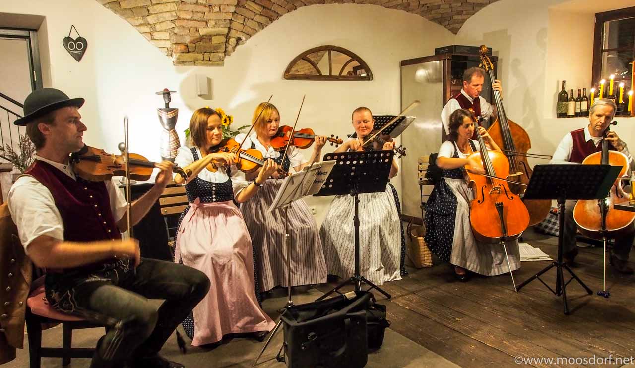 Und natürlich das Essen und Trinken: eine Innviertler Spezialkarte war aufgelegt worden: Mostbraten, Knödel – dazu spezieller Sekt. Und das allerschönste: ganze viele Gäste in Tracht. Dirndl und Lederhosen – vom Gast bis zu den Musikern und zum Wirt – prägten das Bild. Was bleibt ist die Hoffnung auf eine Wiederholung.