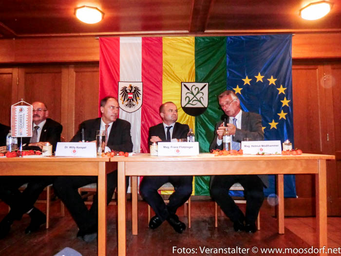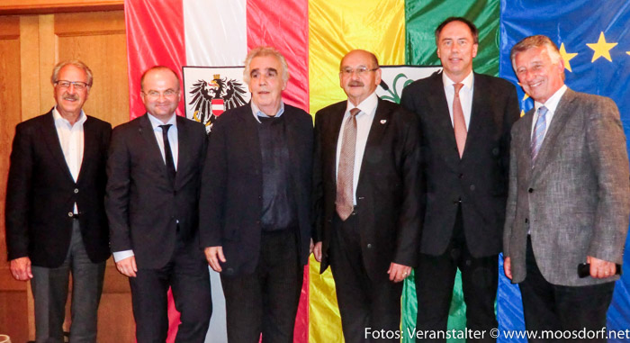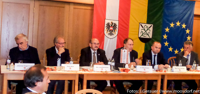 Von links nach rechts: Johannes Voggenhuber, ehem. EU-Abgeordneter, Nationalrat a.D., Autor; Erwin Mohr, 24 Jahre Bgm.a.D.aus Wolfurt, Vrlbg., Präsidiumsmitglied EU-Ausschuss der Regionen; Josef Bachleitner, Obmann des Friedensdialoges, Ehrenbürger von Moosdorf; Dr. Willy Kempel, Gesandter, Außenministerium; Mag. Franz Flotzinger, EU-kundiger Jurist, OÖ.Gemeindebund; Mag. Helmut Mödlhammer, Präsident des österr.Gemeindebundes