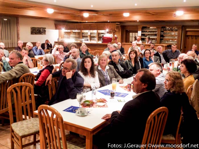 Neben Bezirkshauptmann Dr. Georg Wojak und unseren Priestern, lauschten neben interessierten MoosdorferInnen auch erfreulich viele Gäste aus Nachbargemeinden den Statements. Der lebhafte Dialog entspann sich aus engagierten Fragestellungen aus dem Publikum (Wirtschaft, Politik, Tierschutz, Umwelt uva.) und interessanten, klärenden, vielfach zu erwartenden, aber naturgemäß nicht alle zufriedenstellenden Antworten der EU-Kundigen.