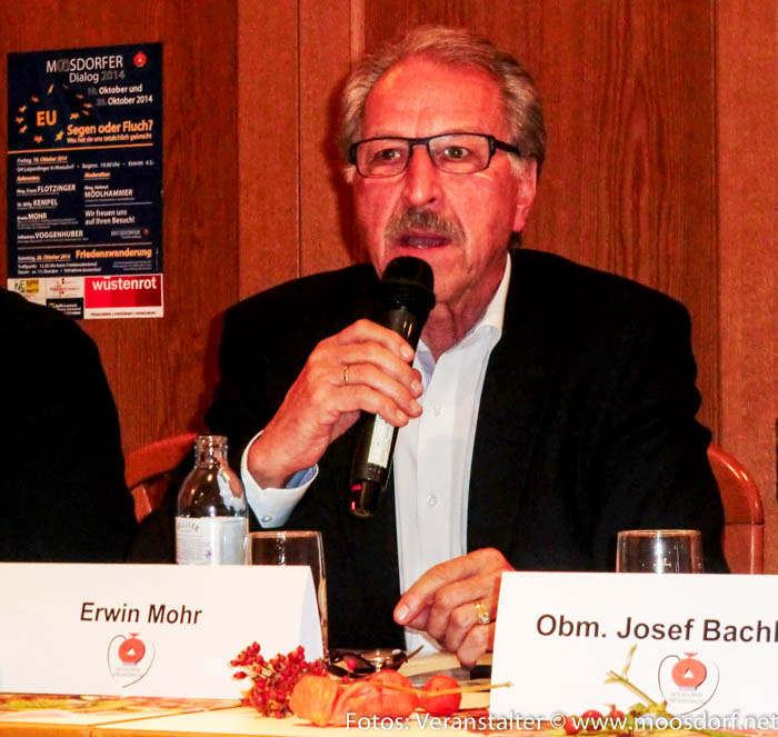 Der Moosdorfer Friedensdialog (Obmann Josef Bachleitner) hatte zum Thema „EU – Segen oder Fluch?“ fünf namhafte EU-Referenten aufs Podium geladen und damit viele Interessierte ins Gasthaus Loiperdinger gelockt.