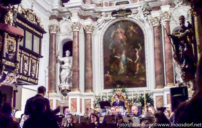 Kapellmeister Johannes Rehrl bot mit seiner Trachten-Musikkapelle Moosdorf dem zahlreichen Publikum ein anspruchsvolles Programm: Fanfarenklänge eröffneten, Festliches, rhythmisch Betontes, ja Bombastisches war zu hören, wuchtige Tonfülle in Filmmusik bis lieblichere Melodienfolgen in Musical-Arrangements, verbunden mit Kurztexten.