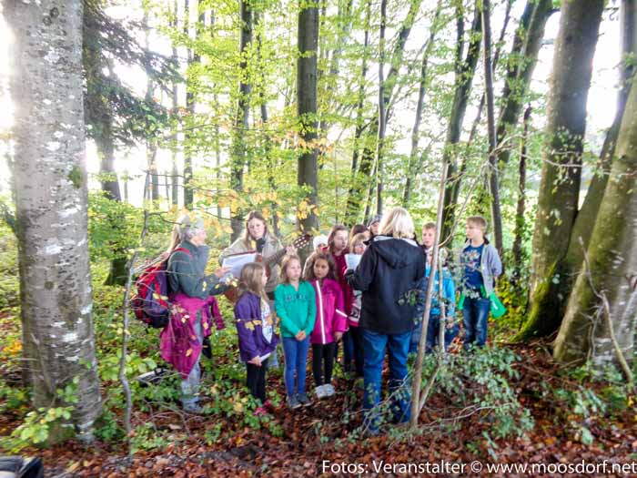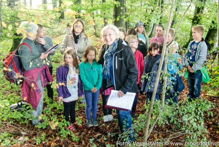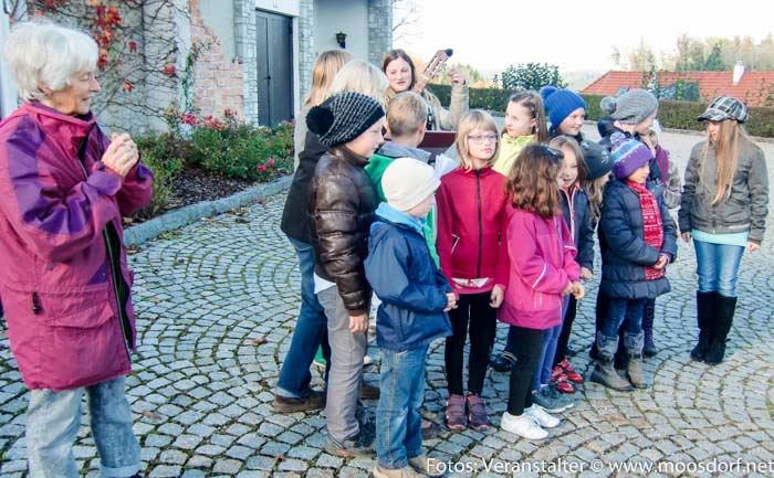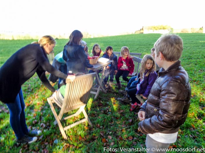 Zurück gings über Stadl nach Gerntal, wo am Waldesrand eine Sitzgruppe mit einem Apfelkorb die Wanderer – übrigens im Alter von jünger als einem Jahr bis ins hohe Alter – empfing. Ein Elfenversteck wartete darauf von den jungen Sängern entdeckt zu werden. Dazu passte gut das Lied „Die kleine Moorhexe“ .