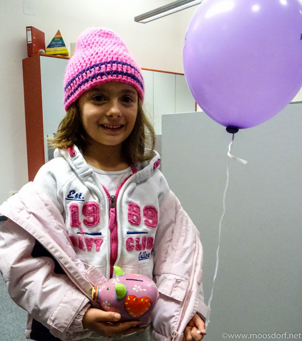 Vor allem die Kinder hatten Spaß. Auch wenn das Sparschwein nicht mehr geschlachtet, sonder auf- und wieder zugemacht wird. Die Spannung, wieviel wohl drin war ist immer noch groß… Und Ballons und kleine Geschenke machten den Besuch auf unserer Bank auch für die Kleinen zu einem Erlebnis.