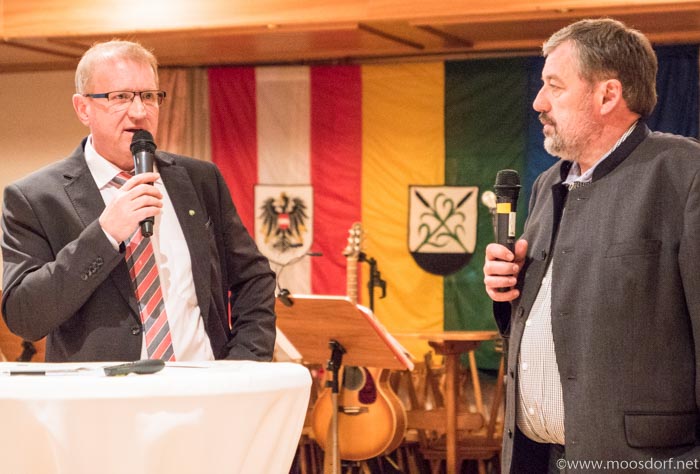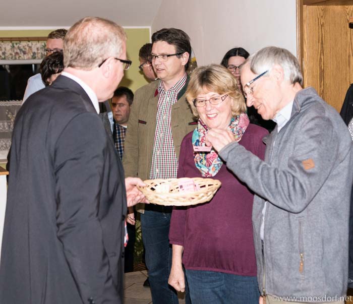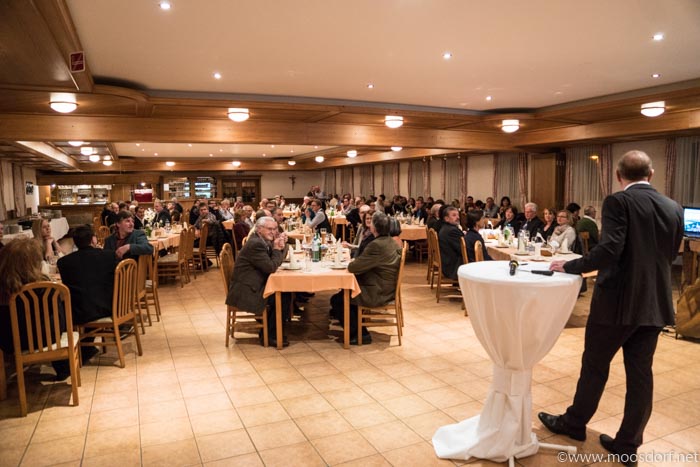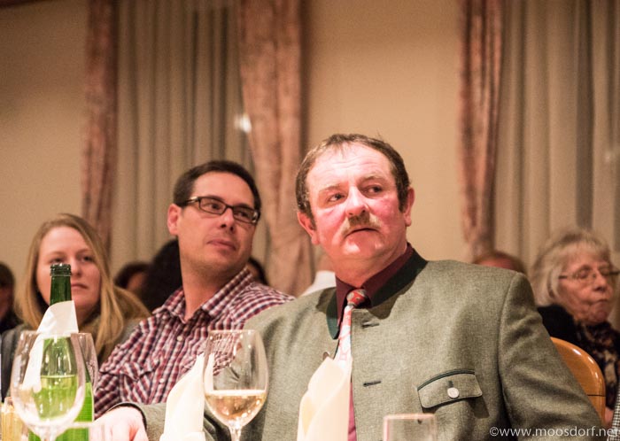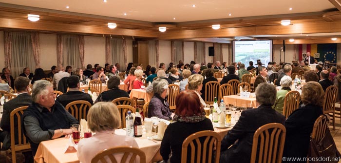 „Wir sollten es doch schaffen, alle paar Jahre den Menschen die in Moosdorf bei Vereinen und Institutionen meist ehrenamtlich Verantwortung tragen Danke zu sagen. Und außerdem ist es mir wichtig, dass wir unsere Vereine und das stetig wachsende Gewerbe in Moosdorf immer mal wieder im wahrsten Sinne des Wortes an einem Tisch zusammenbringen. Darum machen wir das heute abend…“ So begrüßte unser Bürgermeister die mehr als 100 Anwesenden. Und er erklärte auch gleich, wie die Tischplatzierung zustande kam. „Wir wollten nicht, dass wieder immer die gleichen zusammen sitzen, sondern dass es sich heute mal zufällig durchmischt. Darum gab es Tische für jedes Unternehmen und wir haben beim hereinkommen euch den Tisch ziehen lassen, an dem ihr sitzen werdet heute abend. Also: ausgelost wurde…“
