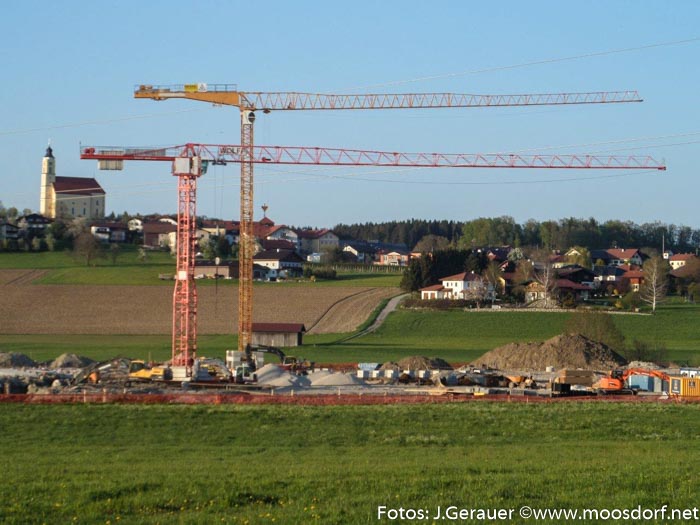 Wenn Baustellen frühlingshaft sprießen, dann zeigt sich das in enormen Erdbewegungen, in umfangreichen Baustelleneinrichtungen und aufragenden Kränen. Auf der Großbaustelle der Gewürzfirma ZALTECH in Moosdorf scheinen zwei Kräne zur Zeit alles zu überragen, sogar die Kirche am Berg? Jedenfalls hat Moosdorf derzeit zwei weithin sichtbare, hervorragende Höhepunkte mehr! Naja, zugegeben: Wie so oft kommt es auf den Standpunkt an, von dem man aus etwas betrachtet….