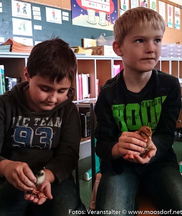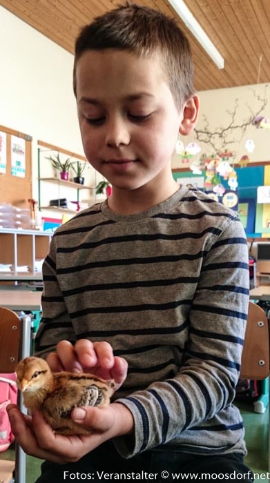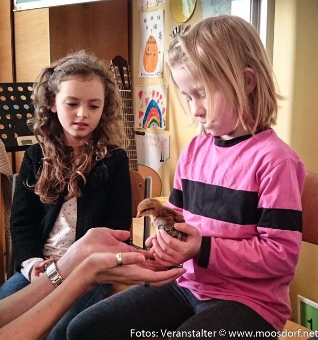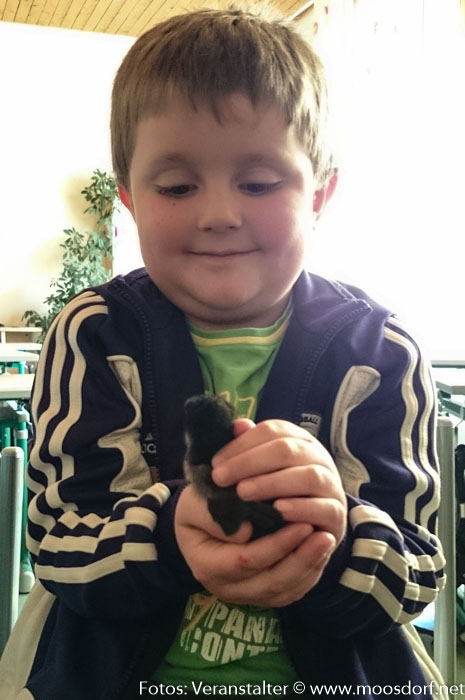 Vor Ostern stand das Thema „Familie Huhn“ auf dem Programm. Besonders aufregend war der Besuch einiger kleiner Küken, welche mit viel Liebe gestreichelt wurden.