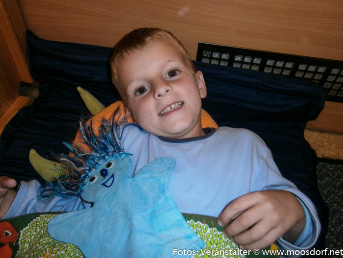 Natürlich brauchten die Kinder danach noch eine kleine Stärkung, bevor die Zähne geputzt und die Pyjamas angezogen wurden. Vor dem zu Bett gehen gab es noch ein Bilderbuchkino: „Das Traumfresserchen“ (Michael Ende/Annegert Fuchshuber) und passend dazu durfte jedes Kind ein von uns gebasteltes Traumfresserchen in Empfang und mit ins Bett nehmen. Es war schon 23:30 Uhr als die Kinder in ihre Schlafsäcke schlüpften und schnell einschliefen.