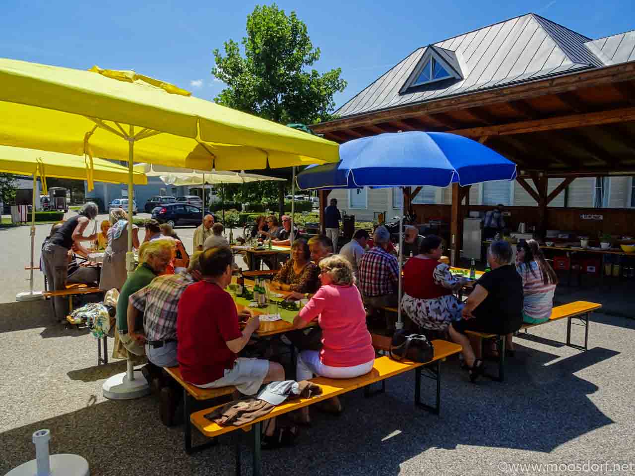 Um 8 Uhr morgens ging es los. Offizieller Start war um elf. Aber es musste ja aufgebaut werden. Alle halfen mit. Sei es beim Aufbau oder bei den Vorbereitungen. So gab es ausreichend Salate und Kuchen und dergleichen. Mit Familie Lenglachner waren Profis am Werk, was die Grillhendl betraf. Die Dorfmobil-Obfrau übergab dementsprechend auch einen kleinen Dankeschön-Gutschein – weil die Hendl nicht nur großartig aussahen, sondern auch hervorragend schmeckten.