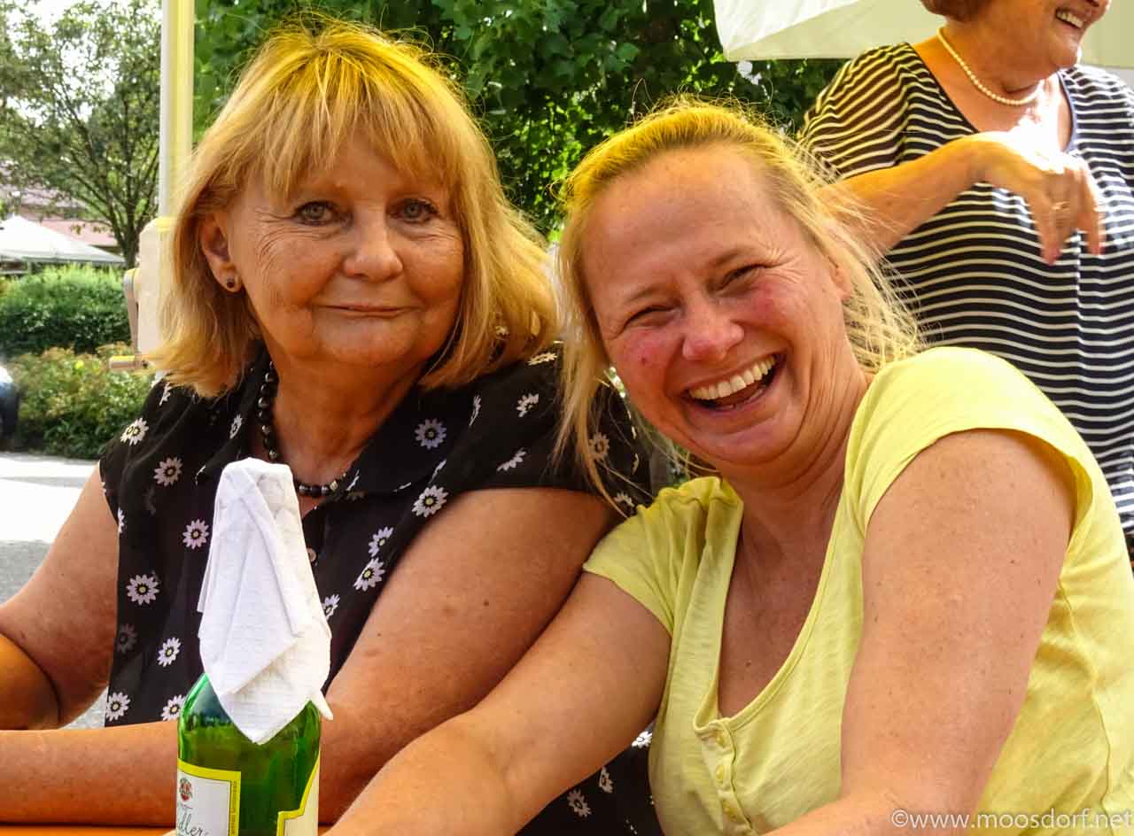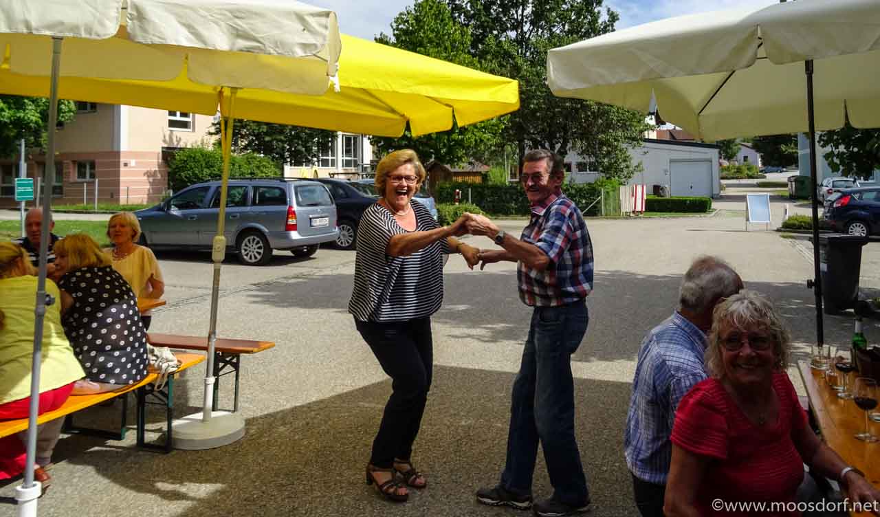 Wie gesagt: zur Verdauung wurde aber nicht nur ein Schnäpschen genutzt, sondern auch so manches Tänzchen gewagt. Denn die Musik des nachmittages ging in die Beine: Josef Gerauer, Insidern als kongenialer Hobby-DJ mit perfektem Musik-Geschmack bekannt und mit schier unendlichem Musikangebot ausgerüstet – legte auf. Dafür hatte er extra seine mobile Soundanlage mitgebracht, mit der er bei bestem Wetter den Platz hinter dem Gemeindeamt zum Tanzboden machte. Und abends gegen neun erklang dann auch noch á capella das Lied von Paulchen Panther… „Wer hat an der Uhr gedreht, ist es wirklich schon so spät…“ Aber bei aller guten Laune am Schluss – aufgeräumt wurde wieder gemeinsam. Und so endete der Tag genauso, wie er auch begonnen hatte: mit großem gemeinschaftlichen Miteinander. Und das macht sie ja aus – unsere Dorfmobilisten.