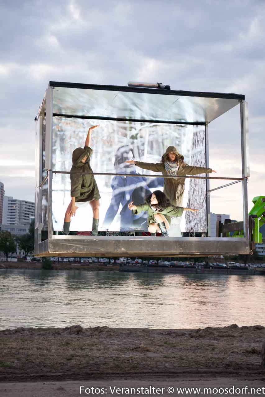 Ein Haus fährt auf dem Treppelweg, ein offener Pavillon auf Rädern, dessen Innenwände aus großen Videowalls bestehen. Unmittelbar vor den Augen der Zuschauer gleiten darin wichtige Szenen von HOCHWALD vorbei. Die Idee dieser mobilen Immobilie weist vielleicht einen architektonischen Weg, wie wir bei schonendem Verbrauch der Grundstoffe, wie etwa Landschaft, Baumaterial und Energie, unsere Lebenswelt so gestalten könnten, dass es sich auch in Hinkunft lohnt, darin zu wohnen.