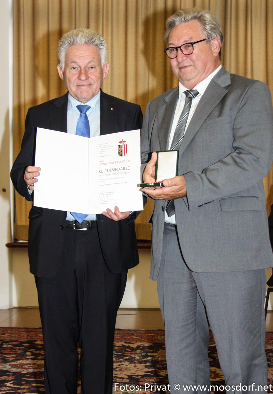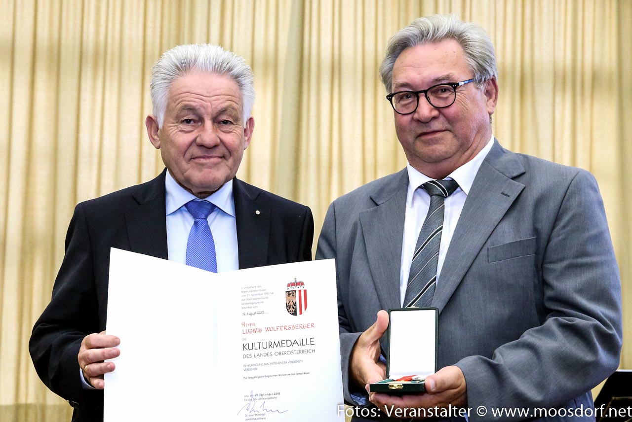 Ludwig Wolfersberger wurde gestern vom LH Josef Püringer mit der Kulturmedaille für besonders herausragende Leistungen im Bereich der Kultur ausgezeichnet. Diese Auszeichnung hat er für seine Verdienste um das Moormuseum in Hackenbuch, sowie seine zahlreichen Projekte für und mit Menschen um das Ibmer Moor erhalten.