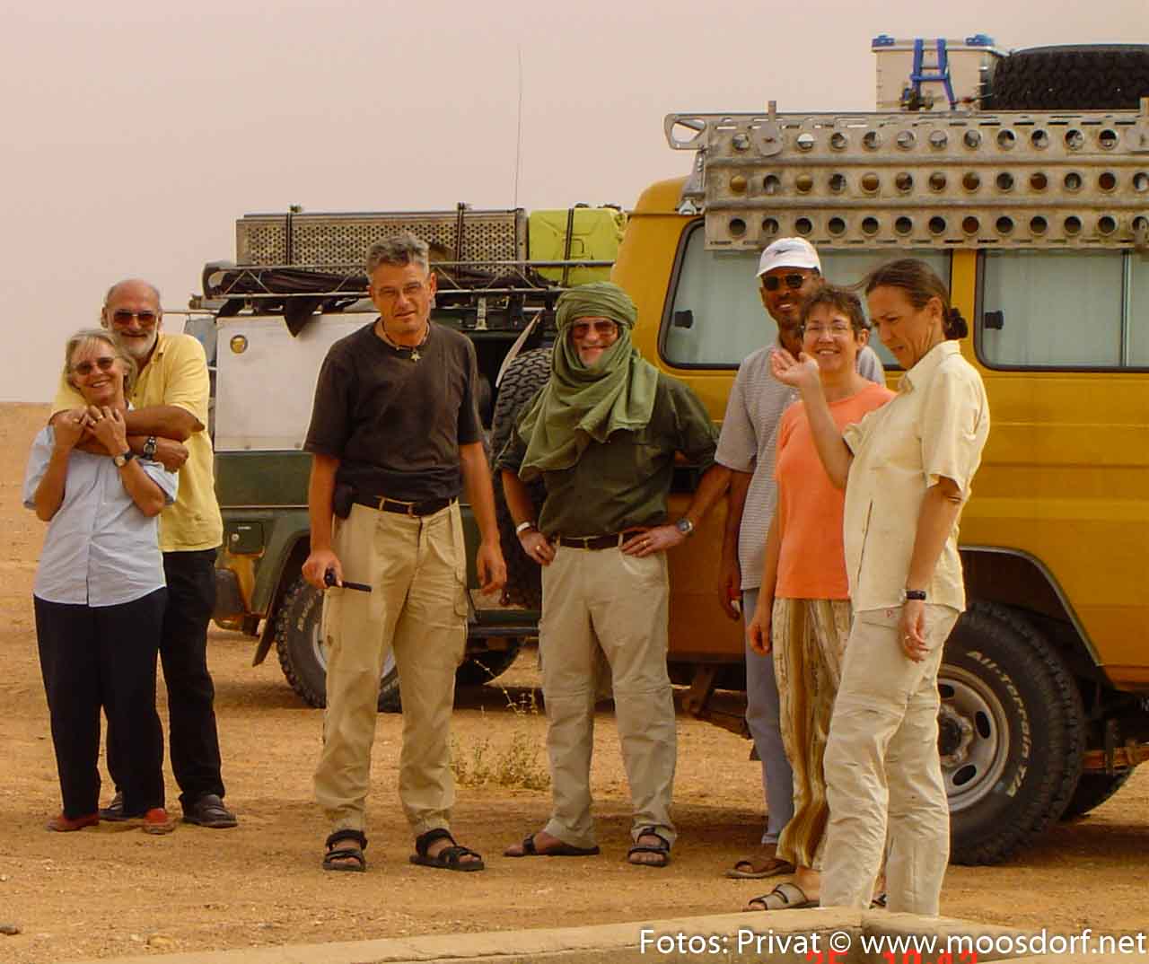 Wir waren eine Gruppe von 4 Autos und 8 Personen; Inge und ich, Günther und Heidi aus Mühldorf, Otto und Monika aus Altenmarkt, und Thomas aus Schrobenhausen. Da fehlt noch einer? Stimmt, Ali aus Tripolis der damals unvermeidliche Begleiter von der Touristenpolizei. Wir hatten Glück, Ali war ein überaus netter Vertreter seiner Zunft, der uns nie etwas in den Weg legte, überall mitmachte und immer half, wenn Not am Mann war. Also ging es los: am 11. Längengrad!