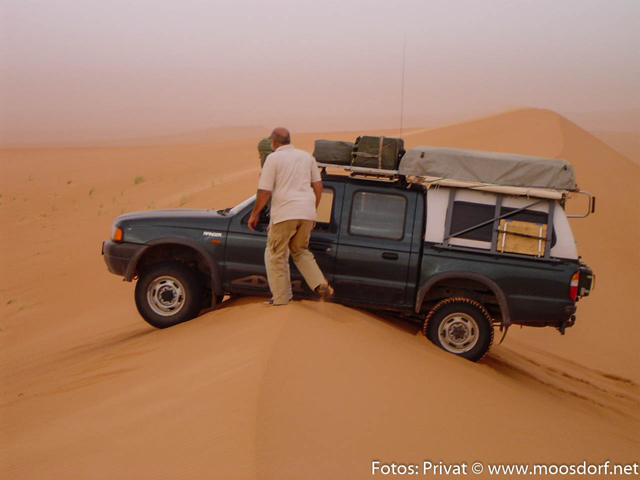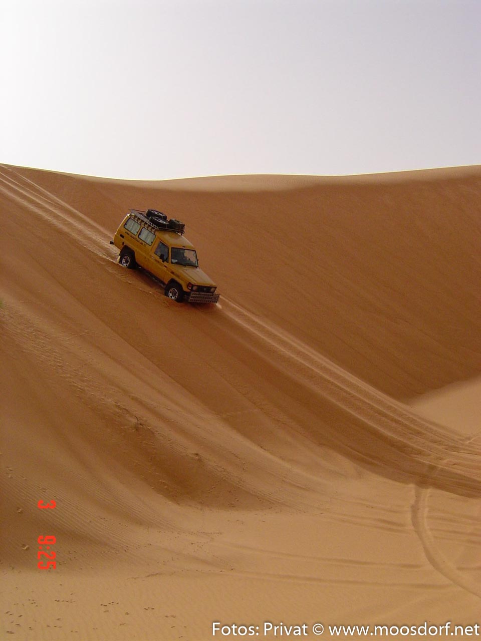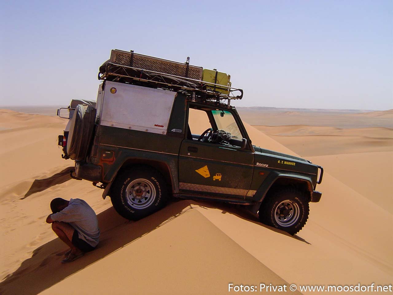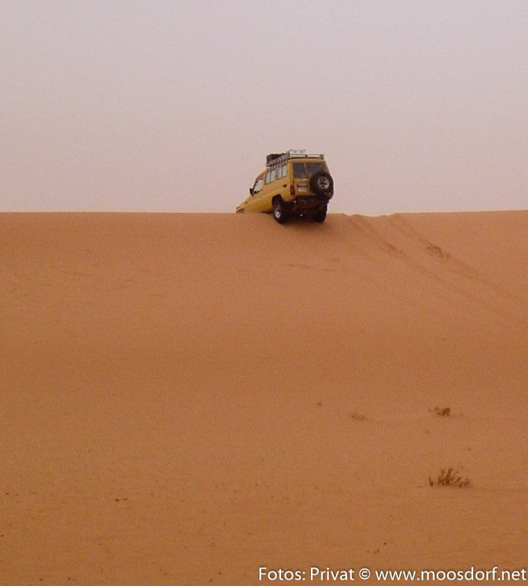 Günther fuhr über die Düne als ob es nichts wäre, Otto folgte mit ein wenig mehr Mühe, schaffte es im zweiten Anlauf. Danach versuchte ich – mit einem Stoßgebet auf den Lippen – mein Glück. Erster Ansatz – zu langsam also retour… Zweiter Ansatz – zu früh vom Gas also nochmals retour… Dritter Ansatz – nun sollte es gelingen: Anlauf, 2.Gang Vollgas, hurra geschafft, die Vorderräder schon in der Luft… nein doch nicht… Aus Angst zu fliegen eine Spur zu früh vom Gas. Und das unvermeidliche passiert: langsam neigt sich das Auto nach vorne und bleibt mit allen (!) vier Rädern in der Luft rittlings auf dem Dünenkamm liegen.