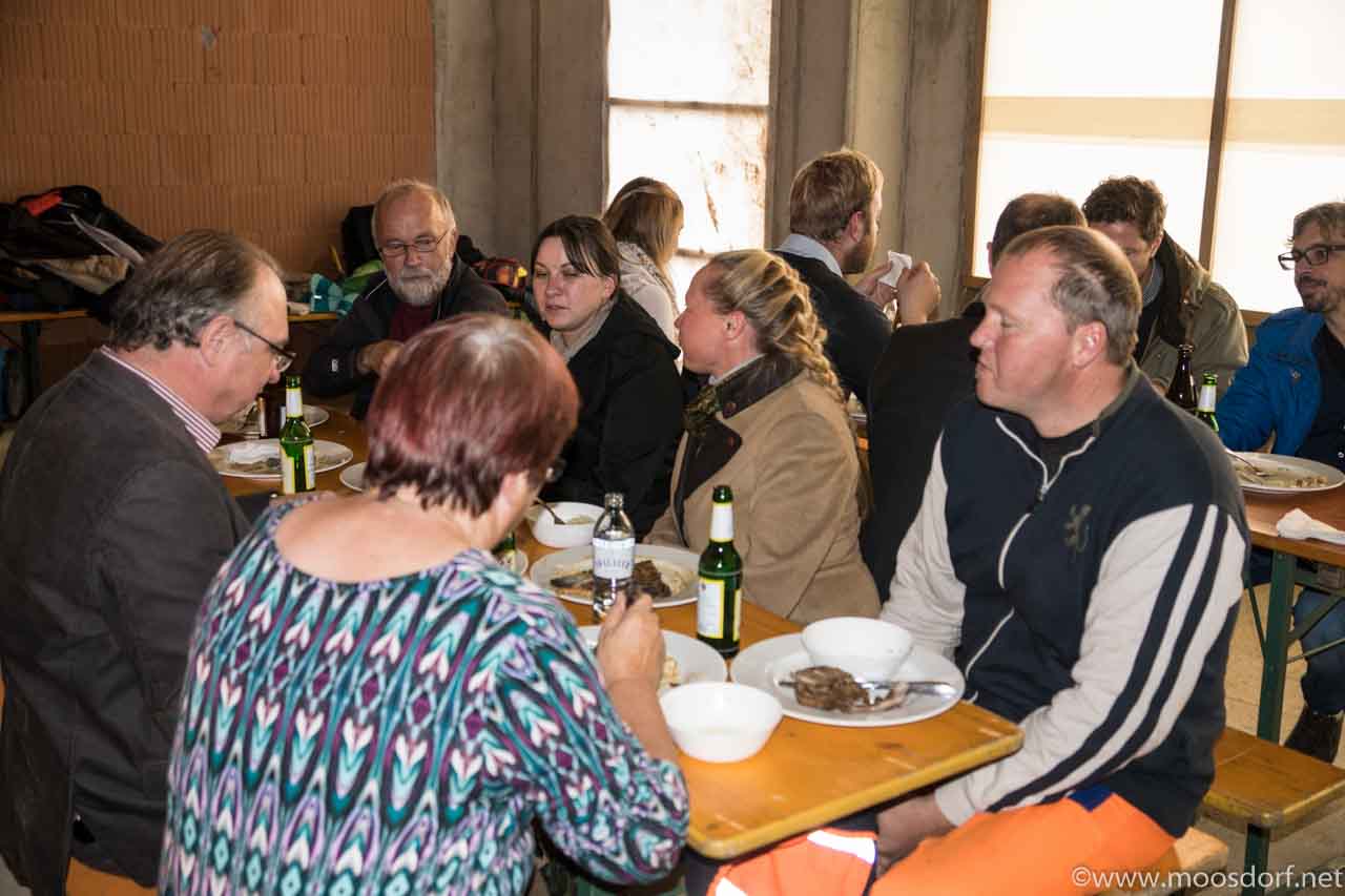 Unser Bürgermeister begrüßte die Kinder, die Ehrengäste, den Gemeinderat und auch die Arbeiter. Die Kinder sangen ein kleines Begrüssungslied und hatten auch eine kleine „Aufführung“ einstudiert. Dann wurde der besondere Firstbaum der Kinder nach oben gebracht und dort am Dachstuhl festgemacht. Danach zog es aber alle rasch in den speziell für diesen Tag geheizten Raum, in dem es dann was zu essen und zu trinken gab.