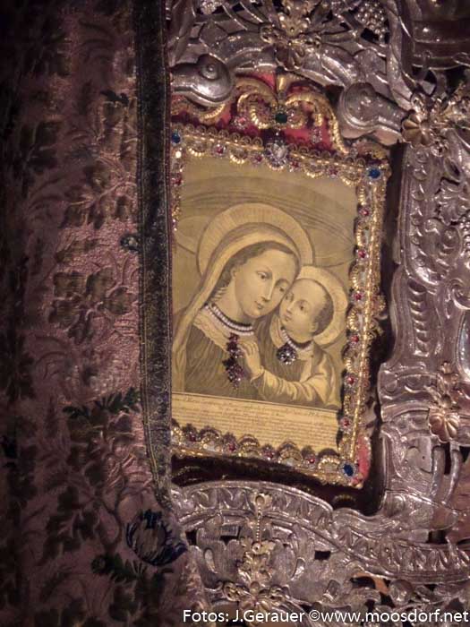 Oberndorfer beim Gottesdienst : „ Seit 1115, also seit 900 Jahren, hat das Bildnis der „Maria vom guten Rat“ eine wechselvolle, ja abenteuerliche Geschichte bis hierher erlebt.“ Heute bedrückt auch hier die Sorge der PilgerInnen um die gegenwärtige Flüchtlingssituation beim Gottesdienst in der kleinen Wallfahrtskirche.