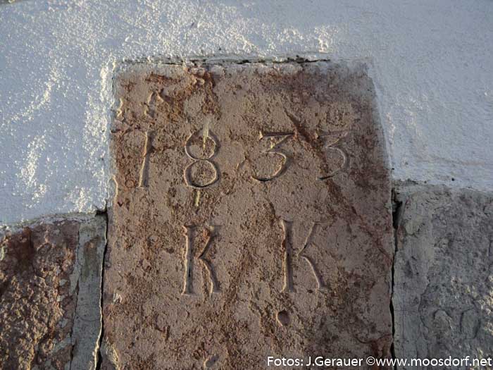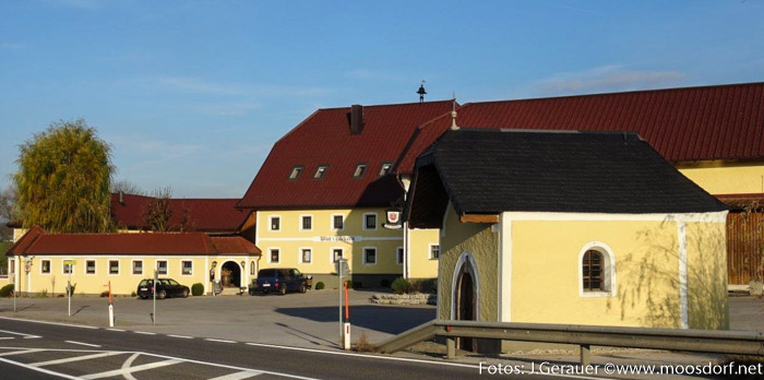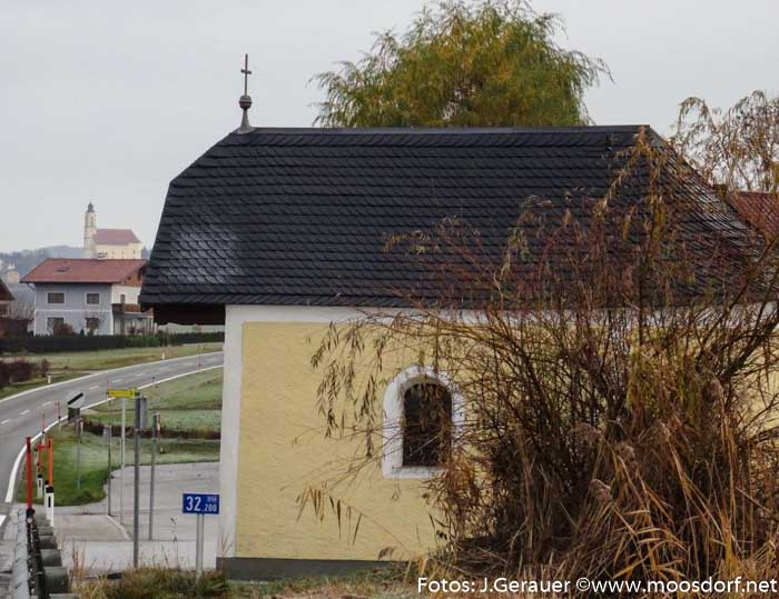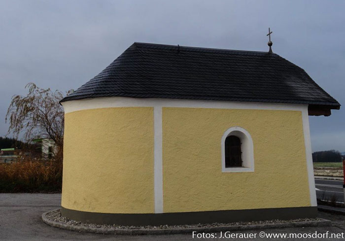 „An dieser Stelle stand früher ein Gasthaus aus Holz. 1813 wurde ein neues Gasthaus erbaut. Während der Bauzeit wurde im alten Holzhaus noch gekocht. Dieses wurde dann abgerissen und 1820 an dieser Stelle die Kapelle erbaut“, notiert Josef Achatz in seinem „Moosdorfer Kapellen“-Katalog.