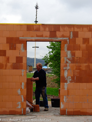 „Der mit den Ziegeln tanzt“ – Fritz Kaltenegger mauerte bei Tochter und Schwiegersohn den 1. Mai ein, S. Wähner fotografierte.