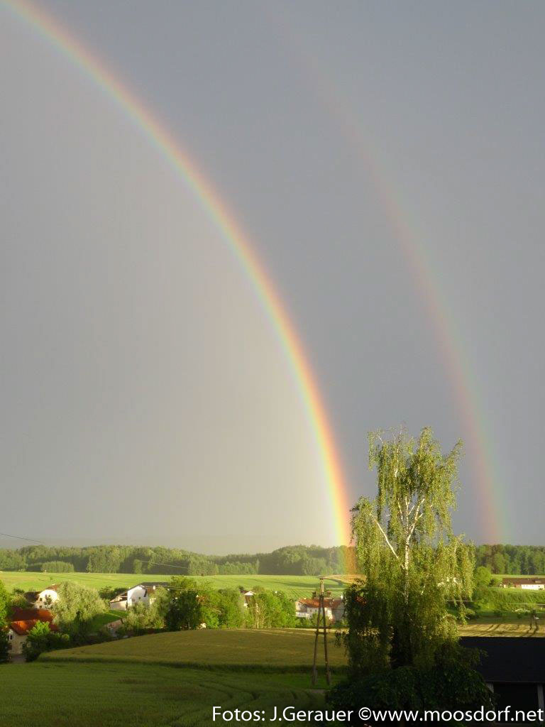 Kürzlich erfreute uns nach mehreren Regengüssen gegen 19:00 Uhr die Sonne über Moosdorf mit einem ungewöhnlich farbkräftigen und rund eine halbe Stunde anhaltenden Doppel-Regenbogen.
