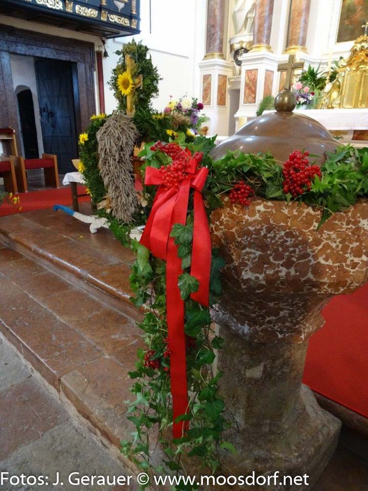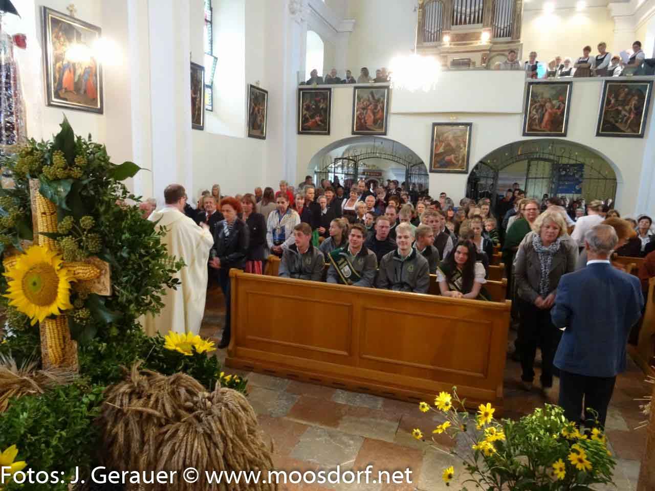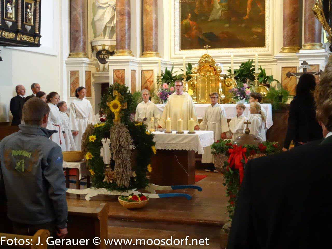 Stattlich wieder die Erntekrone, sorgfältig gebunden von der Landjugend Moosdorf, feierlich ihre Weihe vor dem Gemeindehaus durch Pfarrer Mag. Markus Klepsa, imposant der Festzug zur und in die bemerkenswert schön geschmückte Kirche, geleitet von den Musikkapellen Moosdorf und Hackenbuch und einer großen MinistrantInnenschar, begleitet von Schulkindern (Ltg. Dir. Susanne Wanitschka) Singkreis, Goldhauben, Kameradschaftsbund, Feuerwehr und erfreulich vielen Gläubigen.