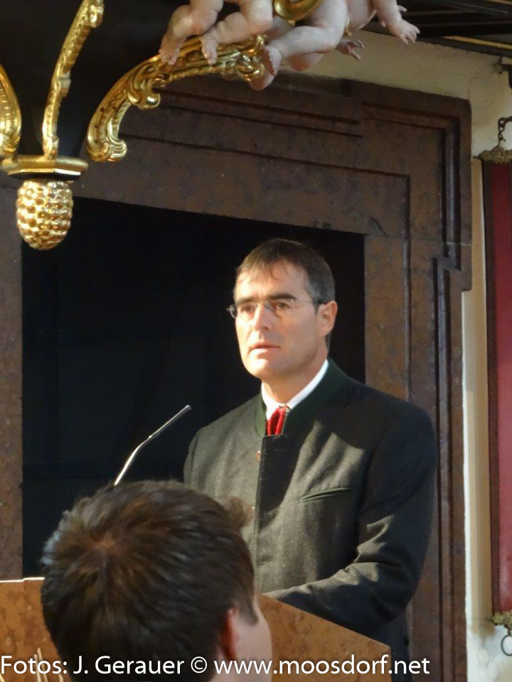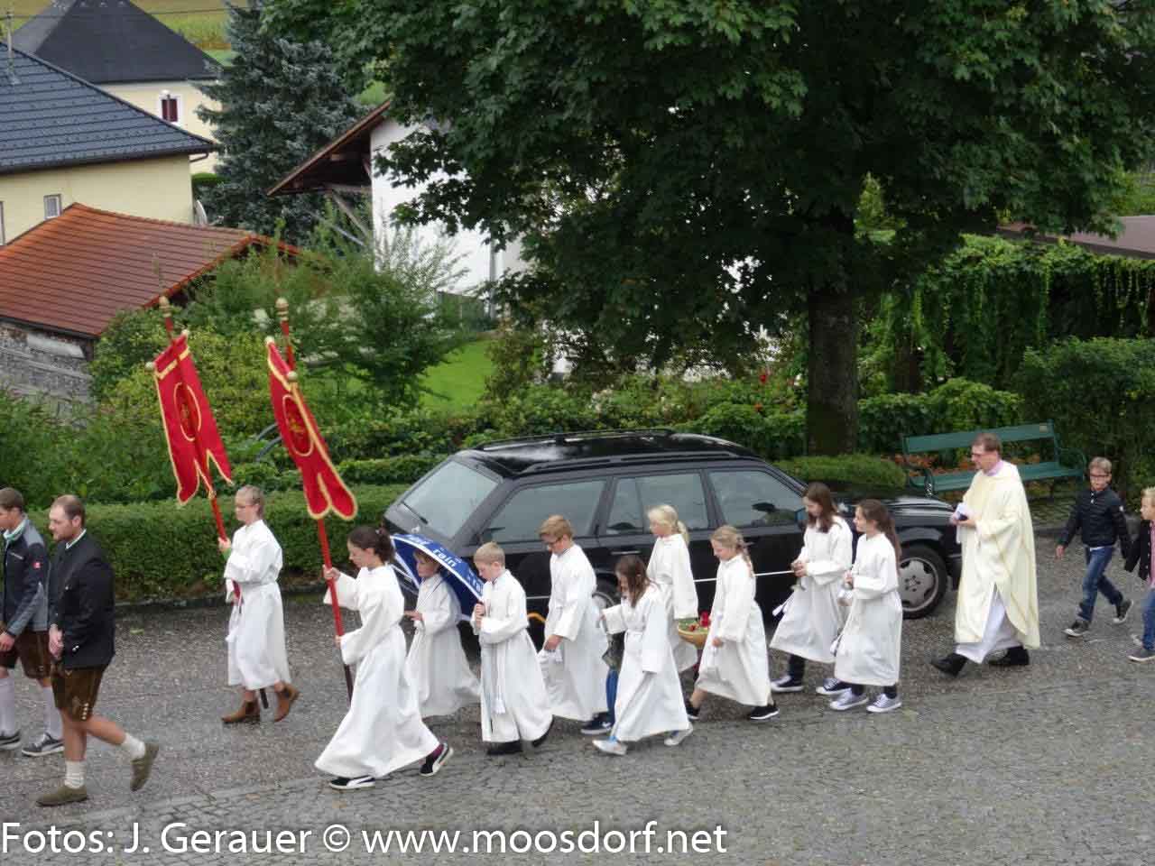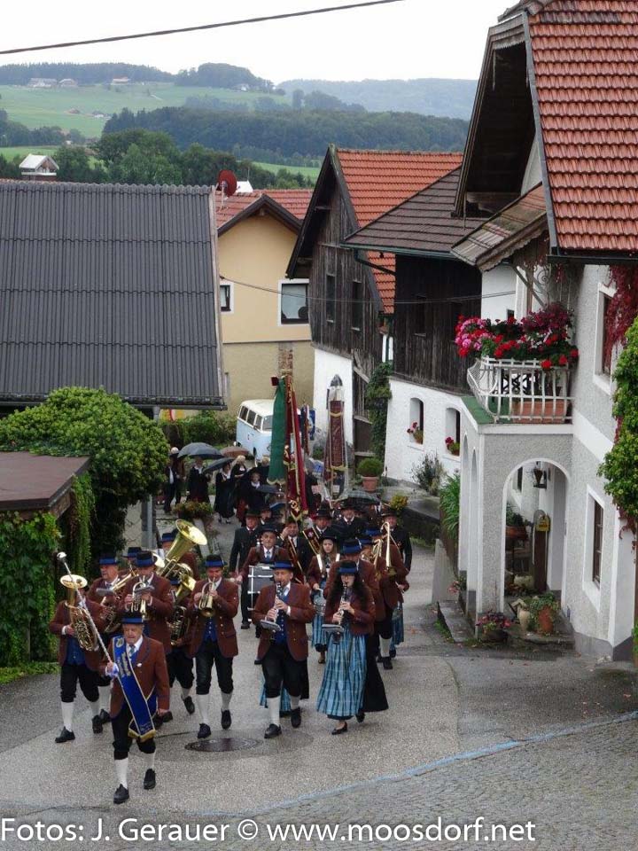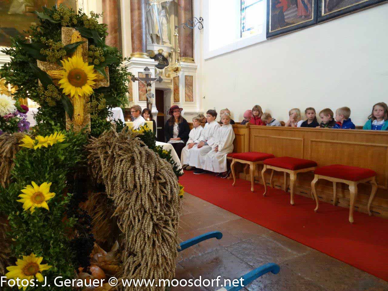 Stattlich wieder die Erntekrone, sorgfältig gebunden von der Landjugend Moosdorf, feierlich ihre Weihe vor dem Gemeindehaus durch Pfarrer Mag. Markus Klepsa, imposant der Festzug zur und in die bemerkenswert schön geschmückte Kirche, geleitet von den Musikkapellen Moosdorf und Hackenbuch und einer großen MinistrantInnenschar, begleitet von Schulkindern (Ltg. Dir. Susanne Wanitschka) Singkreis, Goldhauben, Kameradschaftsbund, Feuerwehr und erfreulich vielen Gläubigen.