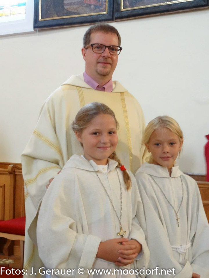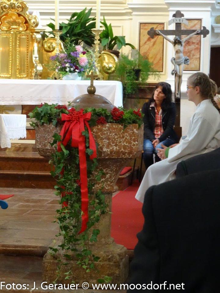 „DANKE zu sagen und dankbar zu sein ist der Zweck des Erntedankfestes“, so Pfarrer Klepsa, denn dankbar müssen wir sein, dass unsere Tische auf vielerlei Art reich gedeckt sind!“ Nicht nur im Zusammenleben unserer kirchlichen Gemeinschaft sind das Menschen, die helfen und mitarbeiten ohne zu fragen, was sie dafür bekommen. Mag. Franz Welkhammer hat bis heuer in Moosdorf Wortgottesfeiern gehalten, obwohl er schon seit vielen Jahren in Vormoos wohnt. Zwei neue Ministrantinnen werden begrüßt, und auch Franz Weiß, der sich -neben Wolfgang Schreckelsberger- als zweiter Mesner zur Verfügung stellt. Festlich angepasst gestaltete der Singkreis Moosdorf (Ltg. Margret Ederer), die Schulkinder (Ltg. RL Anita Treml) trugen ein DANKE-Lied bei.