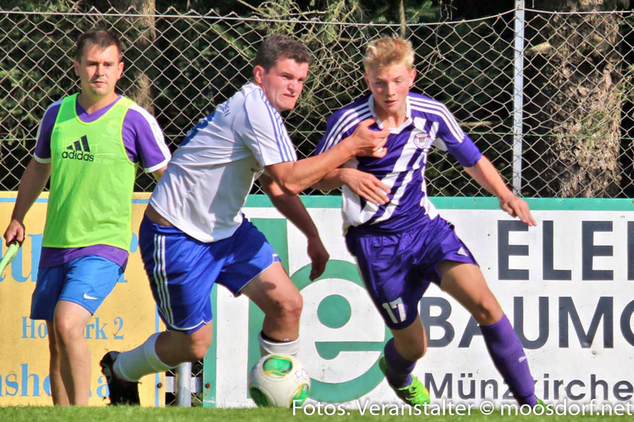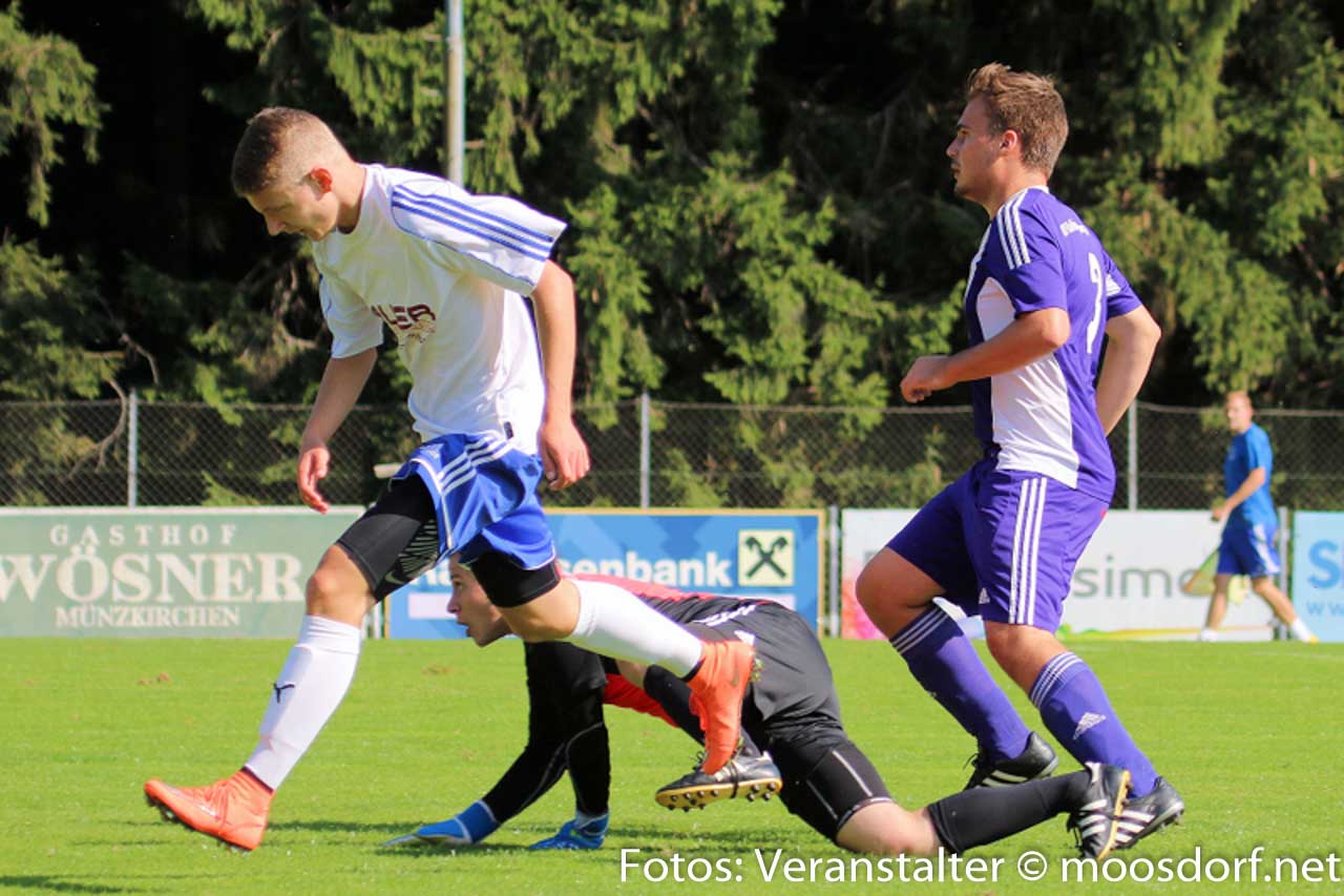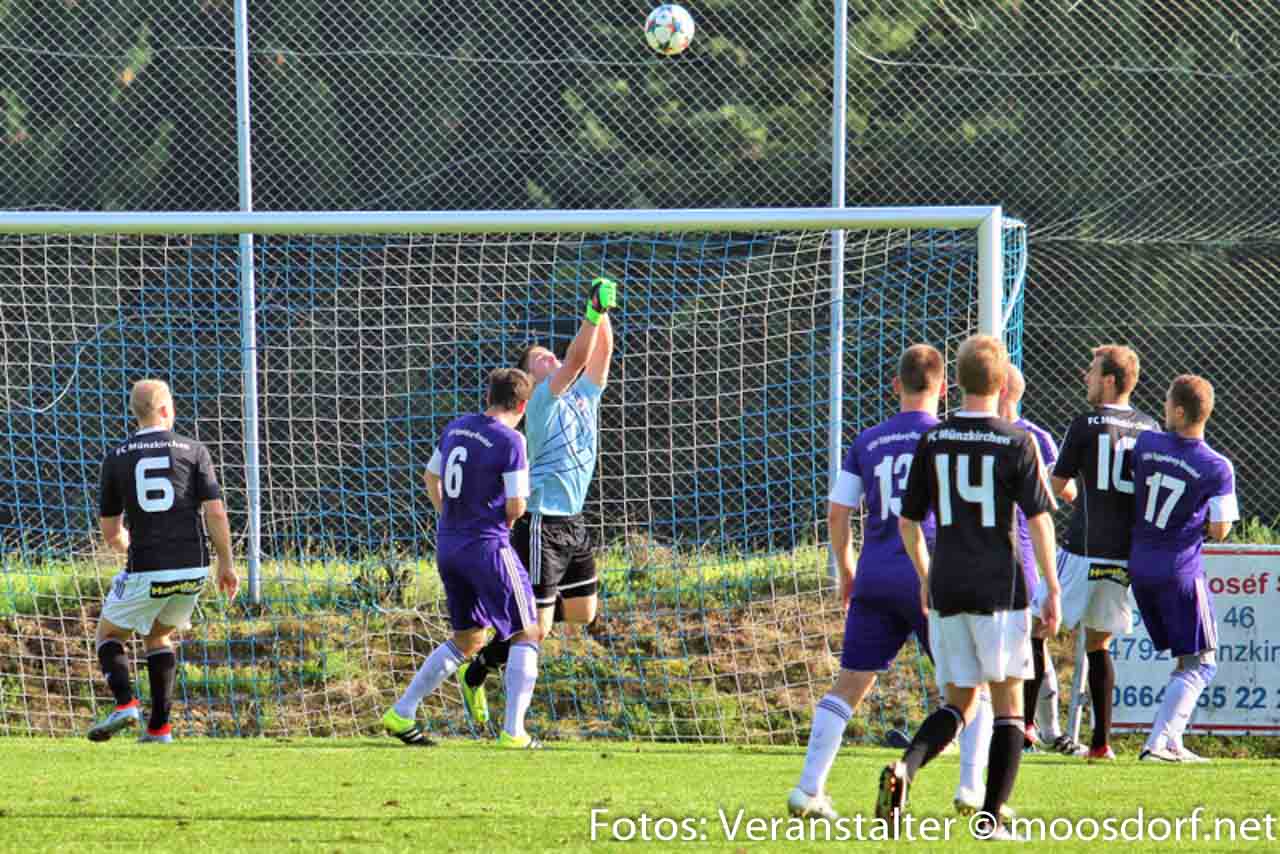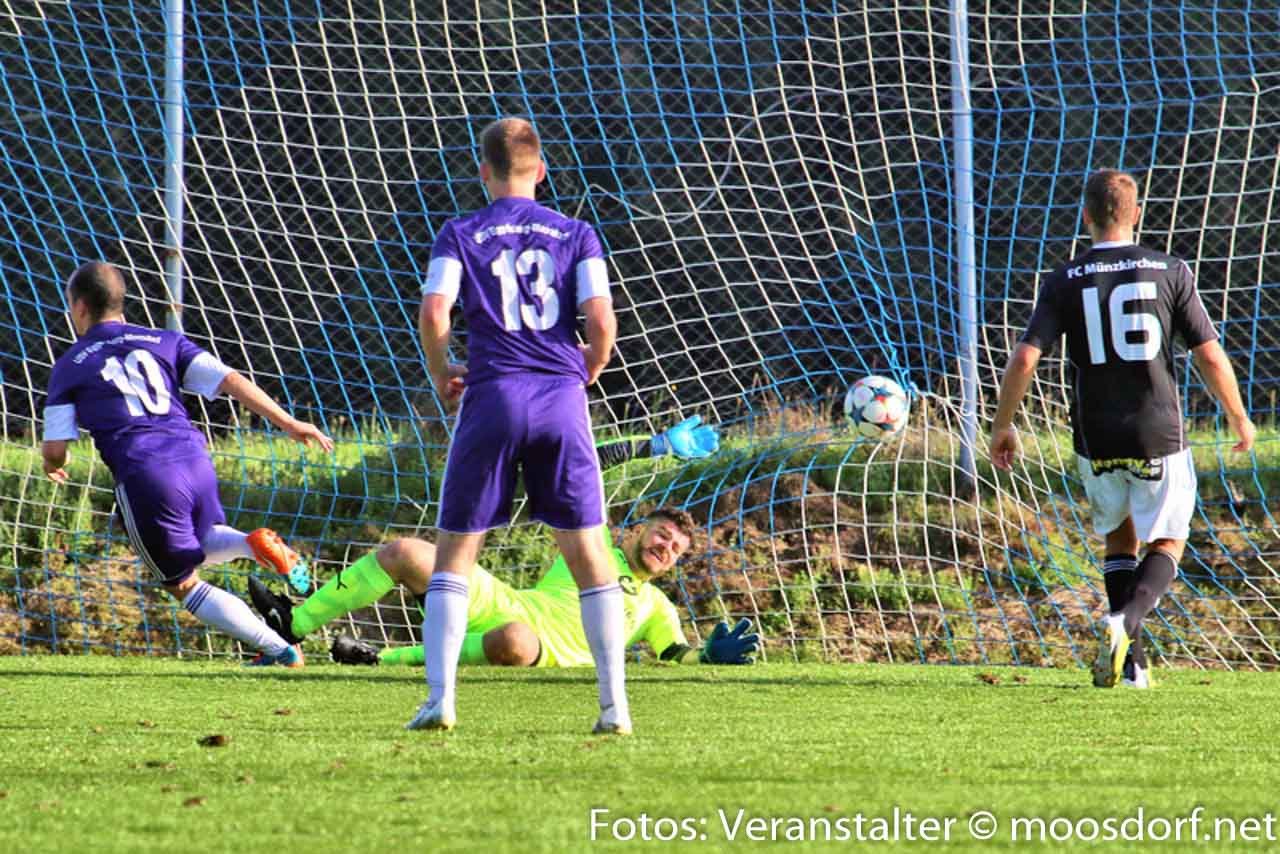 Nach Wiederbeginn war gleich ordentlich Tempo im Spiel. In der 52. Minute eine gute Möglichkeit für den FC Münzkirchen. Nach einem Stanglpass von Josef Hamouz kann der USV Eggelsberg Moosdorf nicht entscheidend klären und Lukas Stadler kommt zum Abschluss und setzt den Ball knapp über das Tor. Glück für den USV. Augenblicke später kontert der USV die Heimischen eiskalt aus. Thomas Webersberger treibt den Ball durchs Mittelfeld und bedient Philipp Ramitsch. Dieser legt sich den Ball aus 20 Meter zurecht und hält voll drauf und sein Schuss schlägt unhaltbar im rechten Eck ein. Der USV ruht sich auf der Führung nicht aus und legt Minuten später mit dem 2:0 nach. Thomas Mühlegger setzt sich auf der linken Seite unwiderstehlich durch und flankt butterweich in den Strafraum, wo unser Goalgetter Philipp Ramitsch lauert und aus kurzer Distanz einköpft. Ganz starke Szene der Beiden. Der USV noch im Freudentaumel, da verkürzen die Münzkirchner nach dem Anstoß blitzschnell auf 2:1. Nach einem langen Ball verliert Christian Webersberger den Zweikampf gegen Daniel Vanek und dieser lässt mit seinem Schuss Philipp Kammerstetter keine Chance. Heißt es nun zittern für den USV? Nein, denn der USV lässt sich nicht wie in den ersten Spielen aus dem Konzept bringen und legt in Minute 80 einen weiteren Treffer nach. Ein langer Ball von Hussen Bari hinter die Abwehr auf Andreas Dürager und dieser zieht von außen in den Strafraum und schiebt den Ball aus spitzen Winkel ins lange Eck zum vorentscheidenden 3:1 für den USV. Danach passiert nicht mehr viel, die Heimischen werfen alles nach vorne, doch der USV steht hinten ganz sicher und lässt nichts mehr anbrennen. Somit fährt man nach den enttäuschenden Saisonstart nun bereits den 3. Sieg in Folge ein und klettert in der Tabelle weiter nach oben. Am kommenden Samstag empfängt man den Titelfavoriten aus Schalchen zum nächsten Derby.