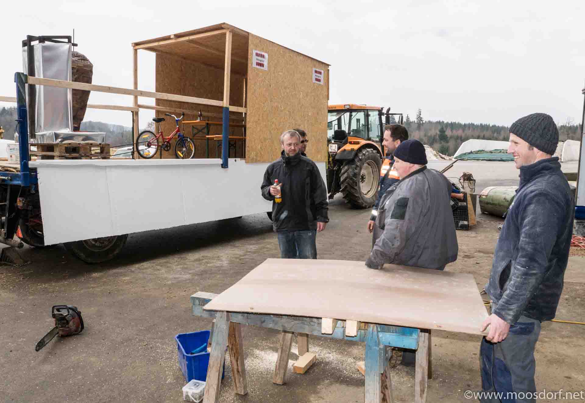 Das beginnt natürlich mit dem Überlegen. Vor allem wenn man, wie die Feuerwehr oder die Landjugend, einen extra gebauten Themen-Wagen beim Faschingszug in Eggelsberg ins Rennen schicken will. Und wenn man dann ein Thema hat, dann ist die Frage: wie setzt man es um. Zum Glück sind genug handwerklich begabte Menschen bei uns in Moosdorf vorhanden – und das in vielen Vereinen. Und der Kommandant Johann Huber bei der Feuerwehr oder die Familien – wie hier Familie Treml / Kuglerwirt – bei der Landjugend bieten den Platz und die Möglichkeiten, dass der Aufbau gemacht werden kann, wie man auf den Bildern gut sieht. So geht es also: von der Idee zum Wagen.