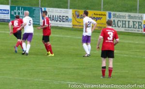 Der USV Eggelsberg Moosdorfzum Beginn mit Glück. Nach drei gespielten Minuten könnte Michael Baischer bereits nach zwei übermotivierten Einsteigen mit gelb/rot vom Platz gestellt werden. Doch Schiedsrichter Rudolf Hofinger beließ es nur bei einer gelben Karte. Augenblicke später hat der USV Grund zum Jubeln. Einen Eckball von Manuel Fuchs verlängert Christian Webersberger mit den Kopf und im Zentrum steht Thomas Mühlegger goldrichtig und schiebt aus kurzer Distanz zur Führung ein.