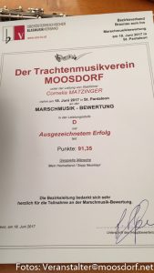 Nach dem Antreten der Musikkappelle folgte man dem Kommando „Im Schritt Marsch“ und die Moosdorfer Musikerinnen und Musiker mit Stabführerin Cornelia Matzinger, erreichten einen Ausgezeichneten Erfolg mit 91,35 Punkten.