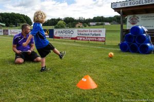 Samstagvormittag bereitete die Nachwuchsabteilung des USV Eggelsberg Moosdorf für die Kinder und Jugendlichen einen abwechslungsreichen und interessanten Spieleparcours vor. Am Nachmittag waren die örtlichen Vereine der Gemeinden Moosdorf und Eggelsberg eingeladen verschiedene Geschicklichkeitsbewerbe zu absolvieren. Gleichzeitig wurde ein kleines Grenzlandturnier der umliegenden Sportvereine (Geretsberg, Gilgenberg, Feldkirchen und Neukirchen) abgehalten. Nach spannenden und umkämpften Spielen entschied die Union Neukirchen das Turnier für sich. Der USV Eggelsberg Moosdorf organisierte auch ein Legenden-Treffen, wo sich die früheren Spieler und Funktionäre in der Geschichte des USV trafen und alte Geschichten Revue passieren ließen. Nach den Siegerehrungen und Prämierungen sorgte die Band Starlight für Partystimmung und die zahlreichen Besucher feierten bis spät in die Nacht.