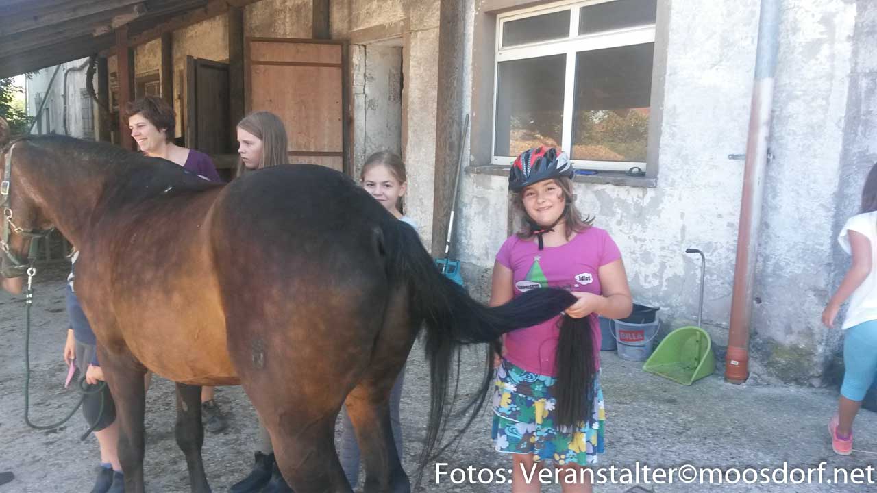 Wir trafen uns um 13 Uhr bei strahlendem Sonnenschein auf dem Ponyhof der Familie Sakoparnig in Hackenbuch. Nach einer kurzen Einschulung durch die Betreuer Simone, Gerlinde und Andrea und einem Puzzle, mit dem drei Gruppen eingeteilt wurden, ging es auch schon los! Alma, Baba und Saskia hießen die drei braven Pferde, die uns zur Verfügung gestellt wurden. Die Kinder putzten und pflegten die Vierbeiner, es wurden tolle Zöpfe in Mähnen und Schweife geflochten und die Hufe eingefettet, bis sie glänzten. Zwischendurch machte jede Gruppe dann einen Stallrundgang, bei dem es wissenswerte Informationen über die Pferderassen, die Gangarten und die Haltung von Pferden gab. Auch die drei süßen Fohlen wurden begutachtet.