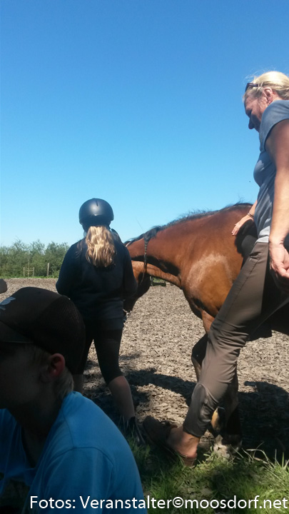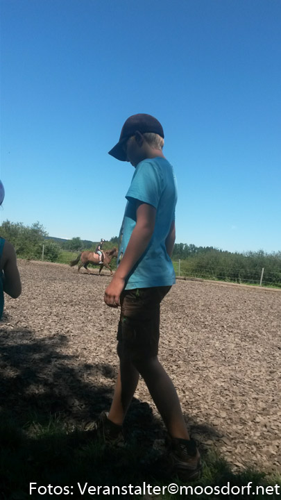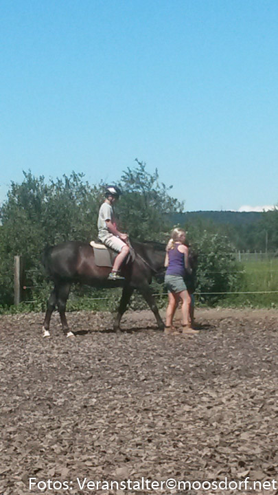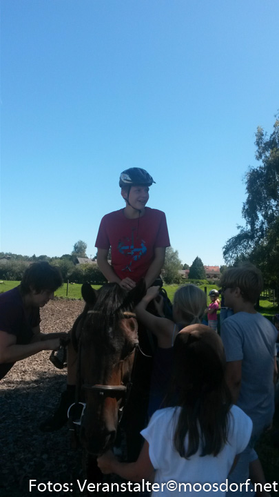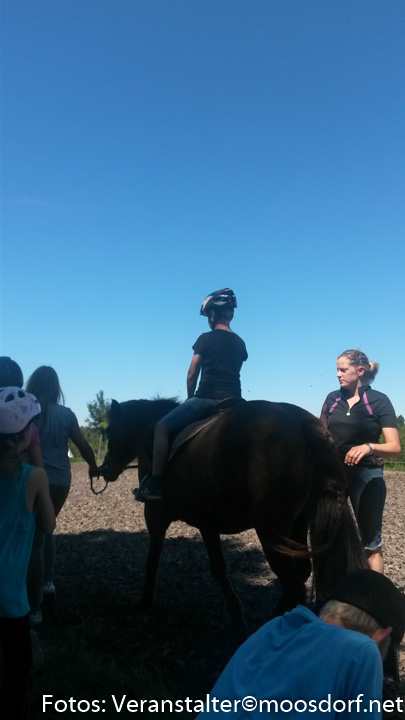Nach erfolgter Pflege wurden die Pferde gesattelt und aufgezäumt und ab ging es Richtung Reitplatz! Ein Ferienkind nach dem anderen drehte seine Runden hoch zu Ross! Alma und Baba wurden mit Sattel geritten, auf Saskia konnten die Kinder ausprobieren, wie es sich anfühlt, ohne Sattel auf einem Pferd zu sitzen. Wir probierten aus, wie es ist, mit geschlossenen Augen zu reiten oder die Hände weg zu strecken. Ein paar ganz Mutige wagten es sogar, sich auf dem Pferd einmal ganz rundherum zu drehen!