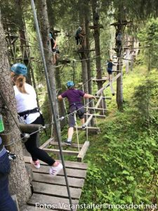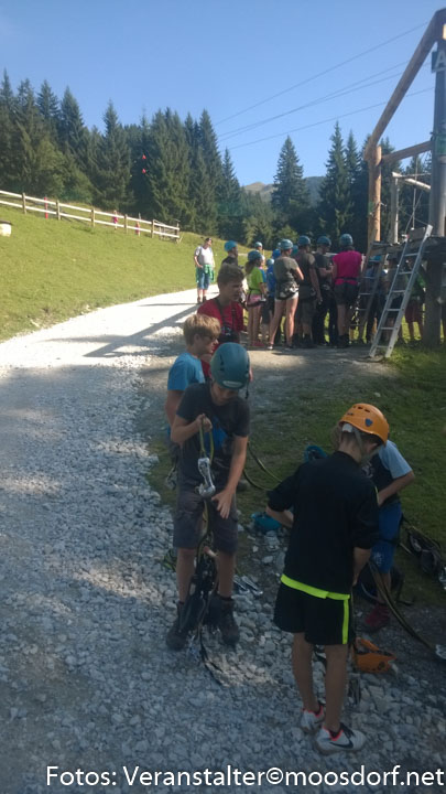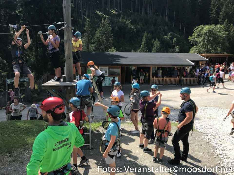 Um ca. 09:30 kamen wir an und wurden mit dem Bummelzug auf die Lindlingalm gebracht, wo ein toller, erlebnisreicher Tag für Groß und Klein begann. Alle die bereits eine Größe von 130 cm zusammenbrachten – das waren 21 Kinder und Erwachsene – wagten den Versuch im Hochseilgarten. Nach einer etwas lang andauernden Einschulung begann aber der Spaß am „Klettern“ und „herumfliegen“. Für die Kleinen bot die Lindlingalm auch eine Menge. Zuerst wurde der 1 km lange Baumzipfelweg erkundet, wo auch die „Kleinen“ einen Hochseilpark vorfanden und danach ging es zum Teufelswasser. Das war natürlich der größte Spaß, plantschen im Wasser, was kann es Schöneres geben. Nach diesen Anstrengungen kehrten die „Kleinen“ auf der Lindlingalm ein, wo auf die „Großen“ gewartet wurde.