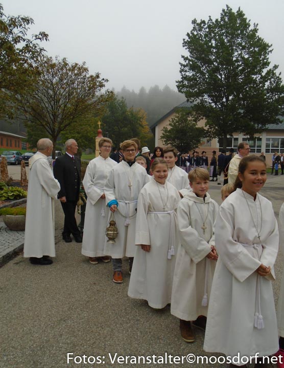 Der Festzug bewegte sich durch den Ort in Richtung Pfarrkirche, auch unser Kirchenmodell wurde zur Feier des Tages mitgeführt. Beim Gottesdienst konnte man feierliche Gesänge vom Singkreis Moosdorf genießen, ergänzt durch ein Danklied der Kinder sowie Volksgesang. Die Fürbitten waren für sämtliche Bevölkerungsgruppen formuliert und wurden auch von verschiedenen Personen, also stellvertretend für die Gruppen vorgetragen. Kurat Ferdinand Oberndorfer feierte ebenfalls mit uns und die große Schar der Ministrantinnen und Ministranten, unterstrich zusätzlich die Besonderheit des Erntedankfestes. Einer der Ministranten war erstmals im Einsatz, zur Freude aller wurde er von Pfarrer Klepsa extra vorgestellt.