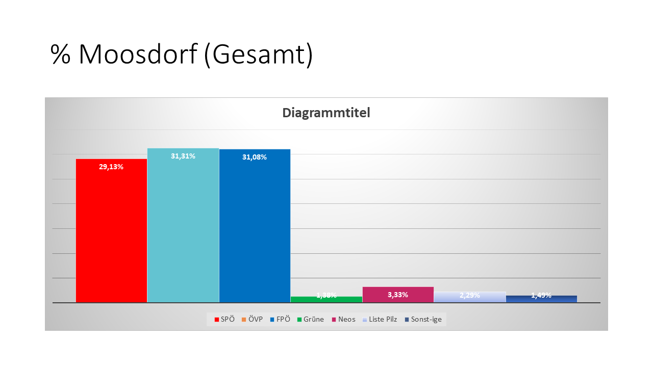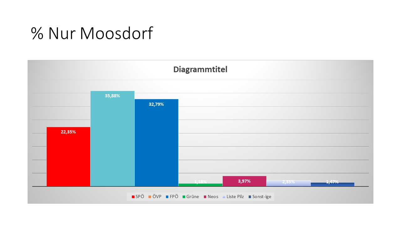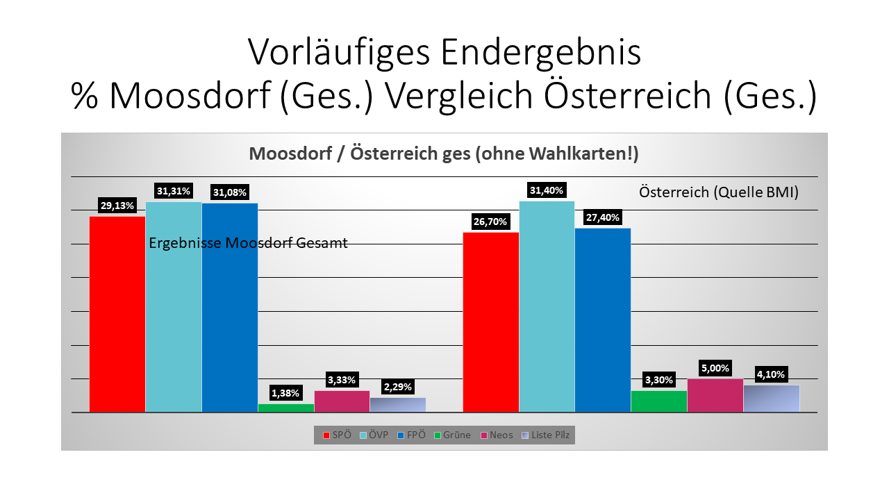 Auch hier ist die SPÖ in Moosdorf etwas besser im Vergleich zu Österreich insgesamt, die ÖVP ebenfalls wieder fast wie im Bundes-Ergebnis und die FPÖ ebenfalls stärker. Bei den kleinen Parteien sind die Werte naturgemäß sehr unterschiedlich zu den Vergleichswerten in Bundesland bzw. Bundesweit.