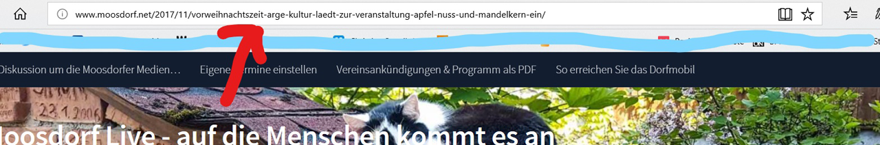 Ein Weg, der immer geht um Inhalte zu teilen ist der Weg über die Adressleiste. Das heißt folgendes: wenn ihr einen Artikel angeklickt oder aufgerufen habt und ihr wollt den teilen oder per EMail weiterleiten, dann seht ihr in der Adressleiste eures Browsers (als Beispiel mal unten der aktuelle Internet-Explorer) die Adresse (der sogenannte Deep-Link) zu genau dem Artikel, den ihr gerade lest. Der Rote Pfeil (ich war noch nie ein großer Zeichner… ) zeigt euch genau wo diese Adresse ist:
